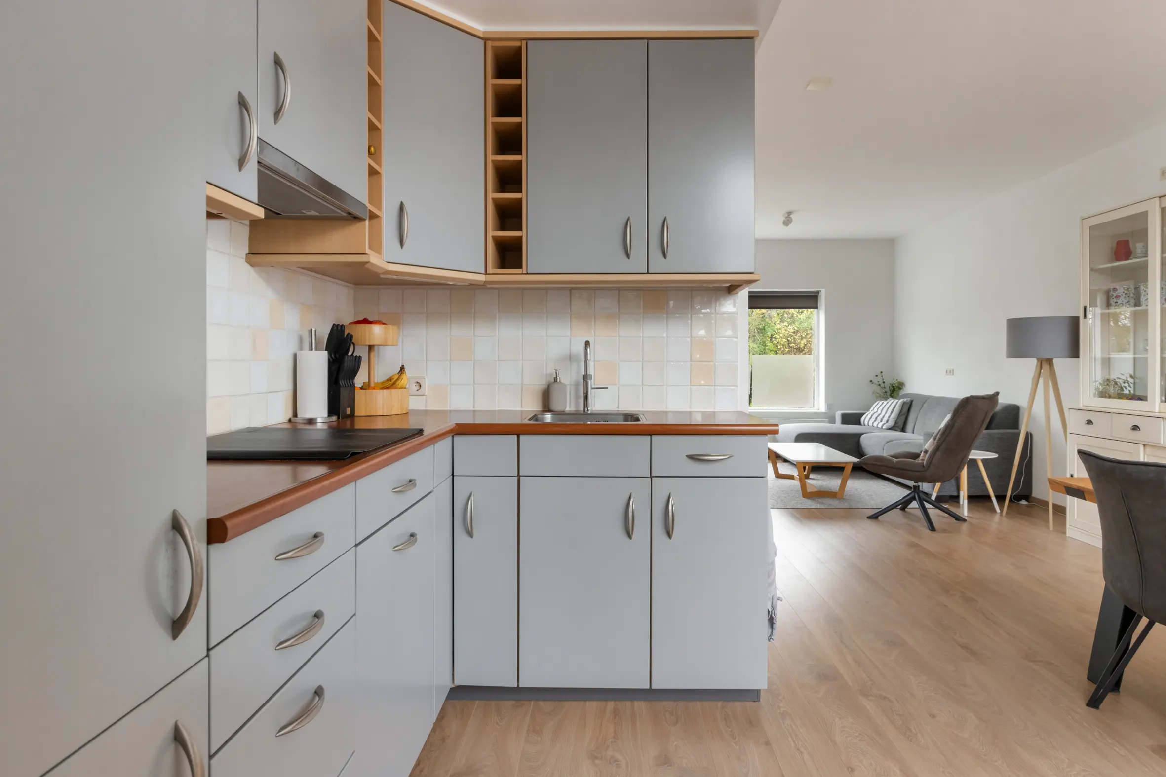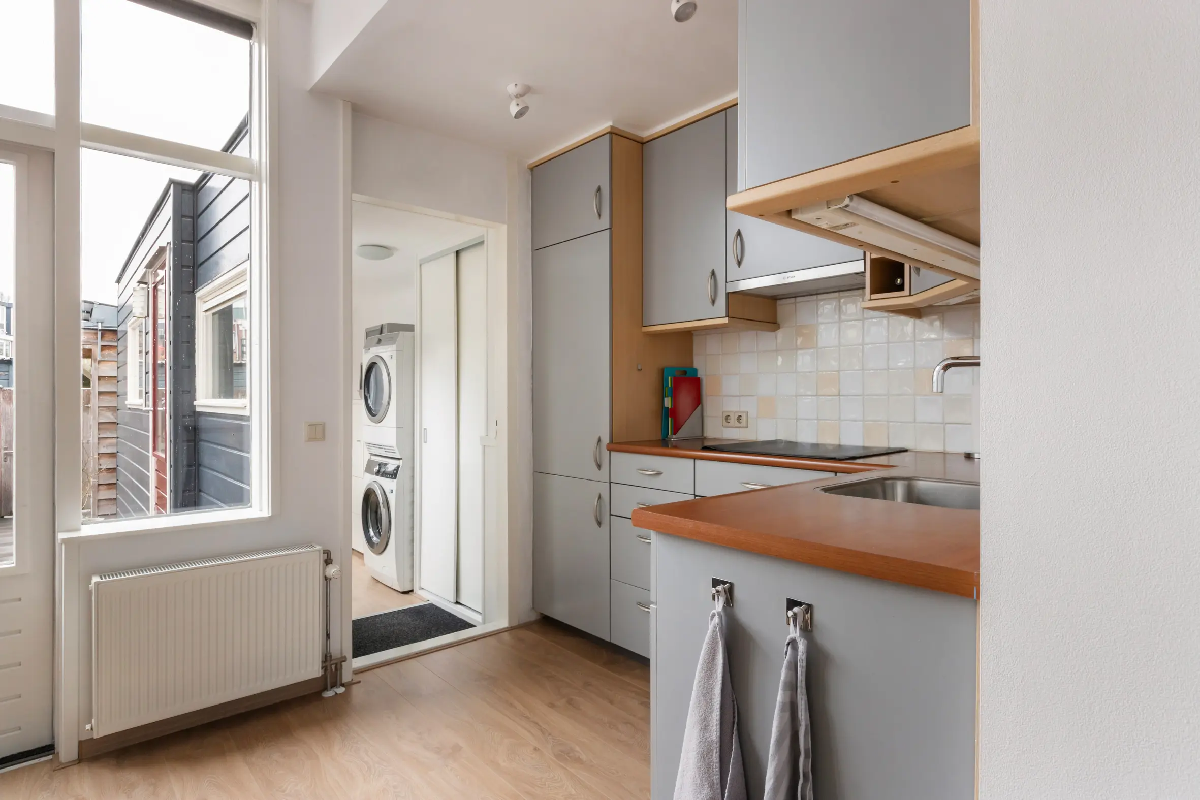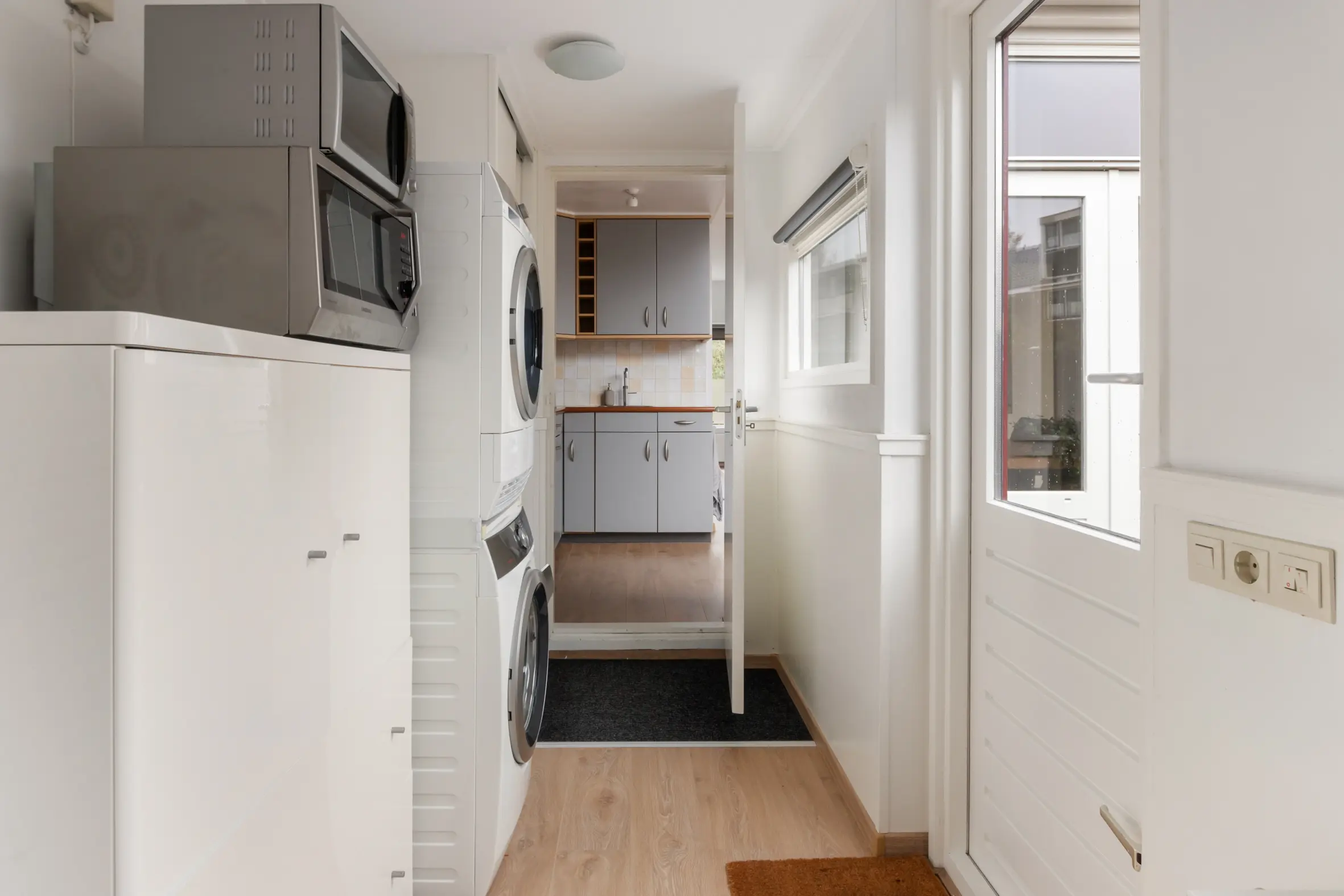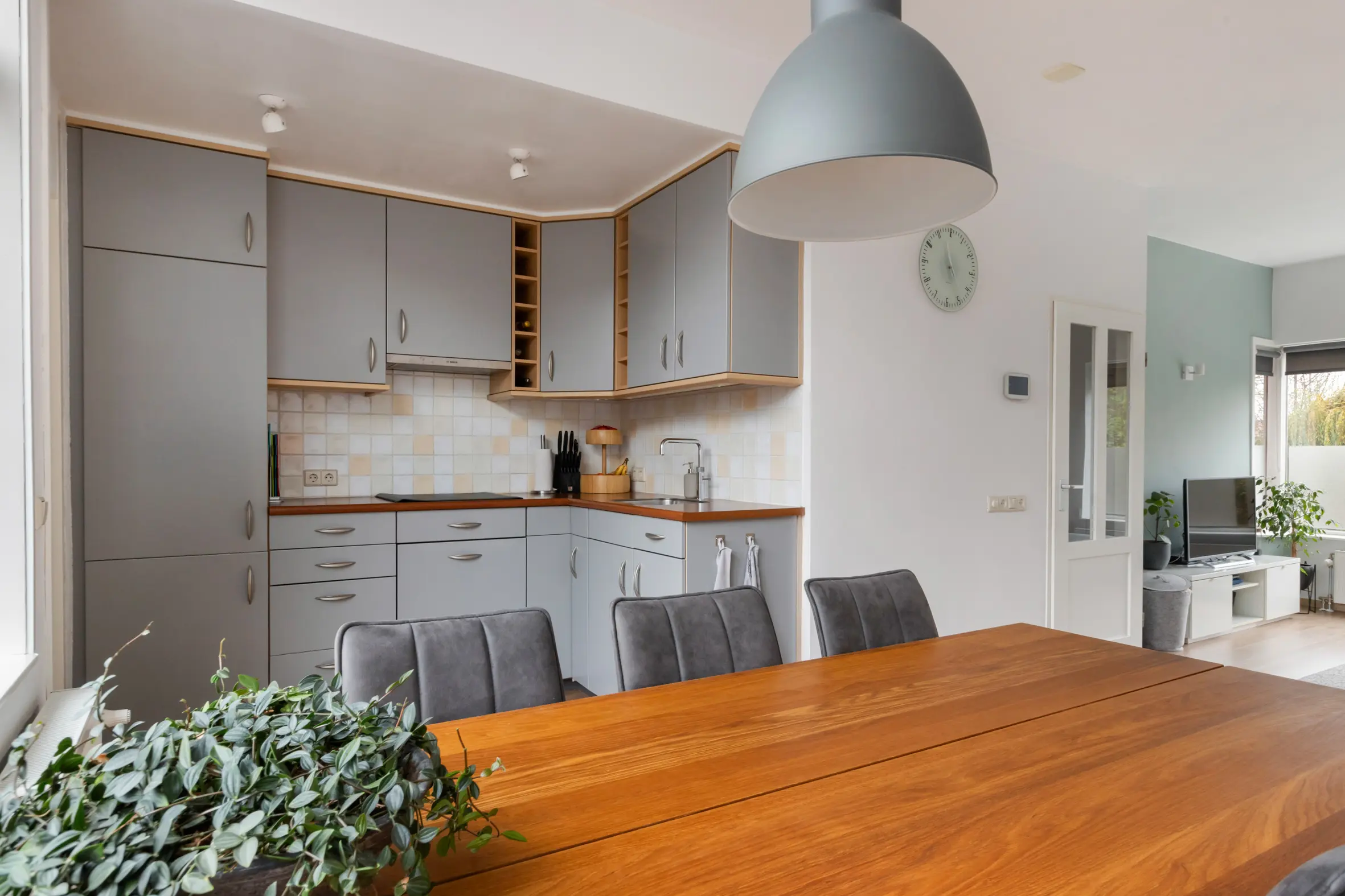 Vanuit de woonkamer is de open keuken in hoekopstelling te bereiken. De keuken met grijze fronten is voorzien van een inductiekookplaat met afzuigkap en koel-/vriescombinatie. Vanuit de open keuken is de praktische bijkeuken te bereiken. Hier bevindt zich de aansluiting voor de wasmachine en droger. De gefundeerde bijkeuken is bij opbouw compleet vernieuwd, geïsoleerd en bekleed met onderhoudsvrij keralit.