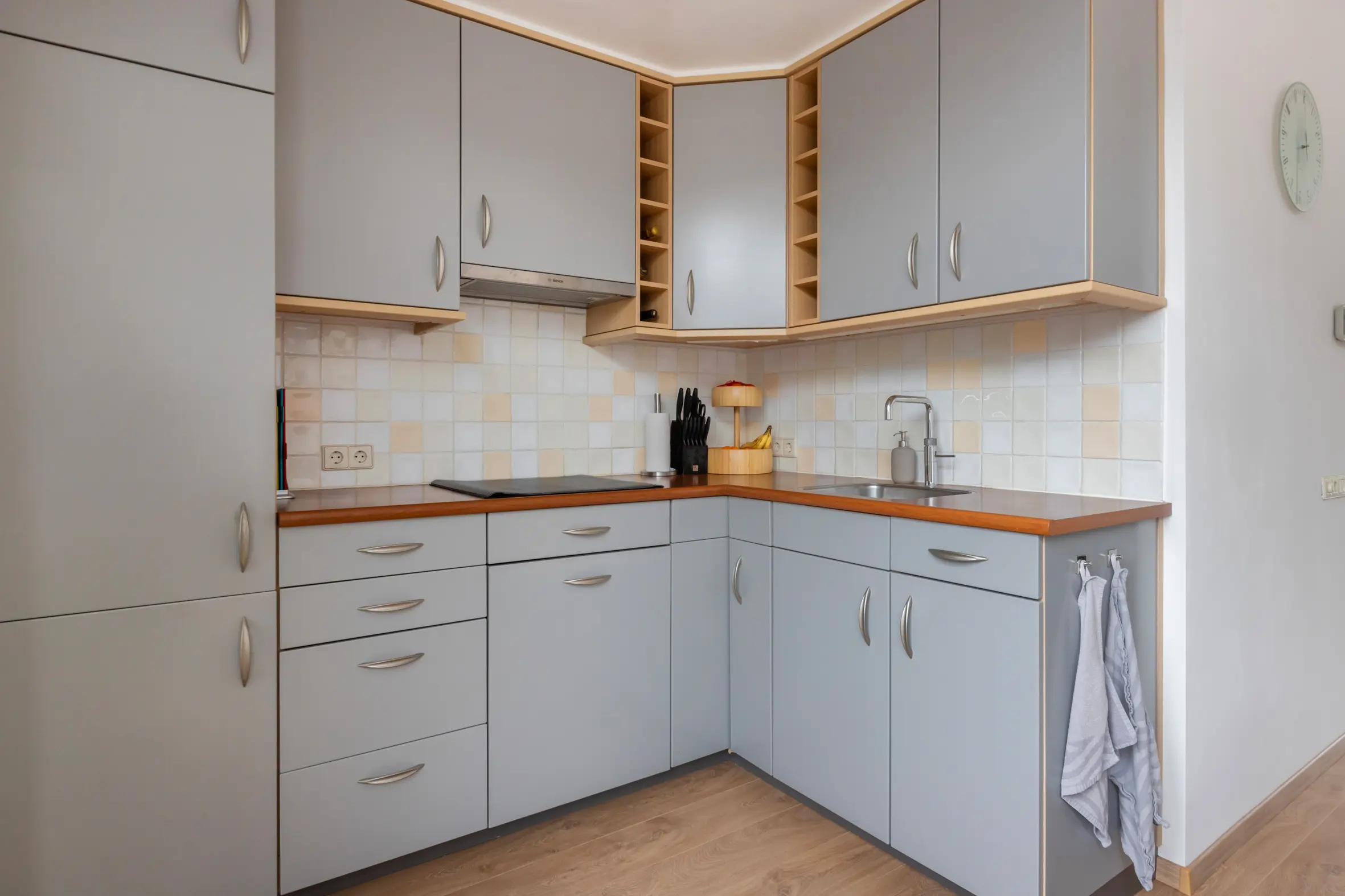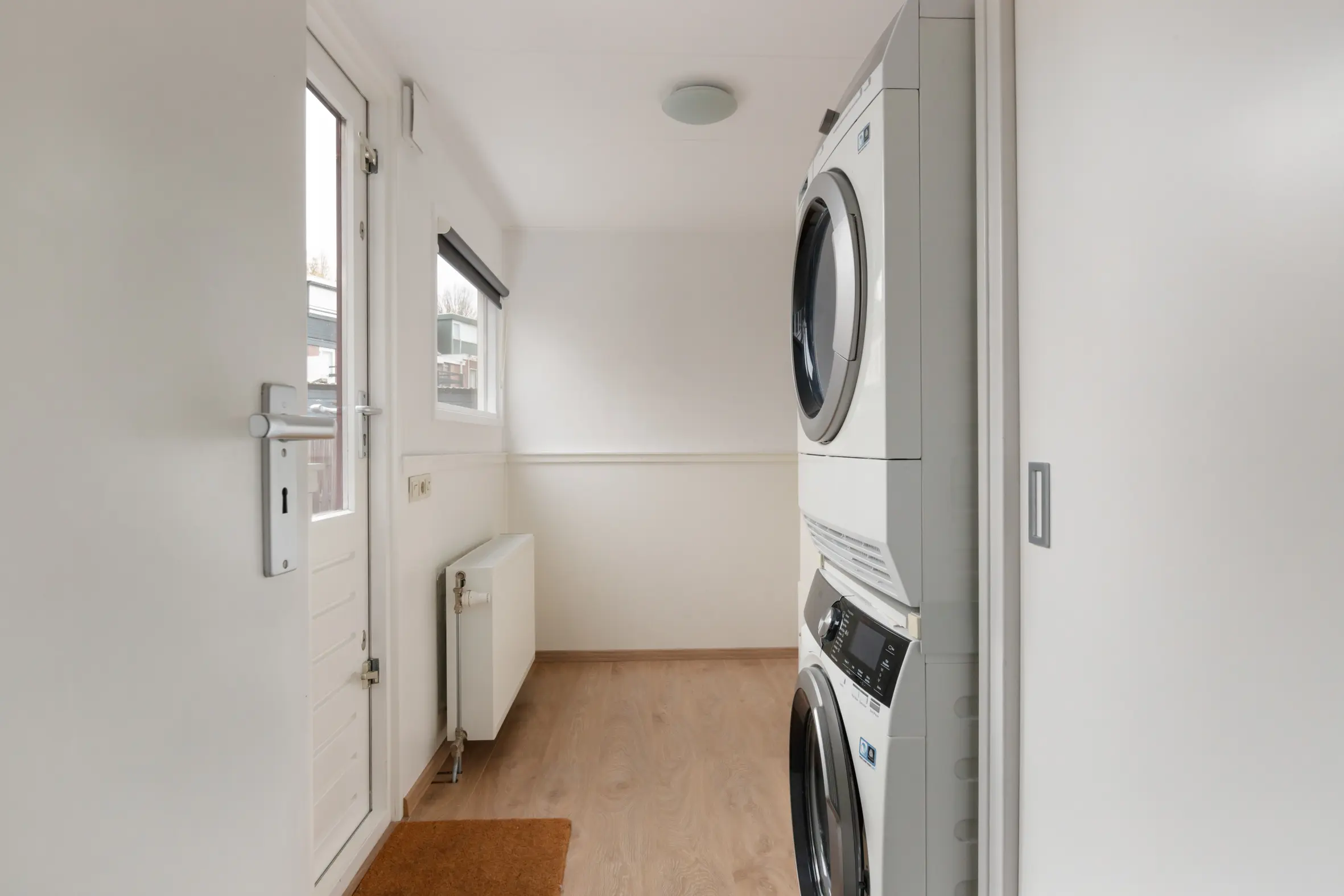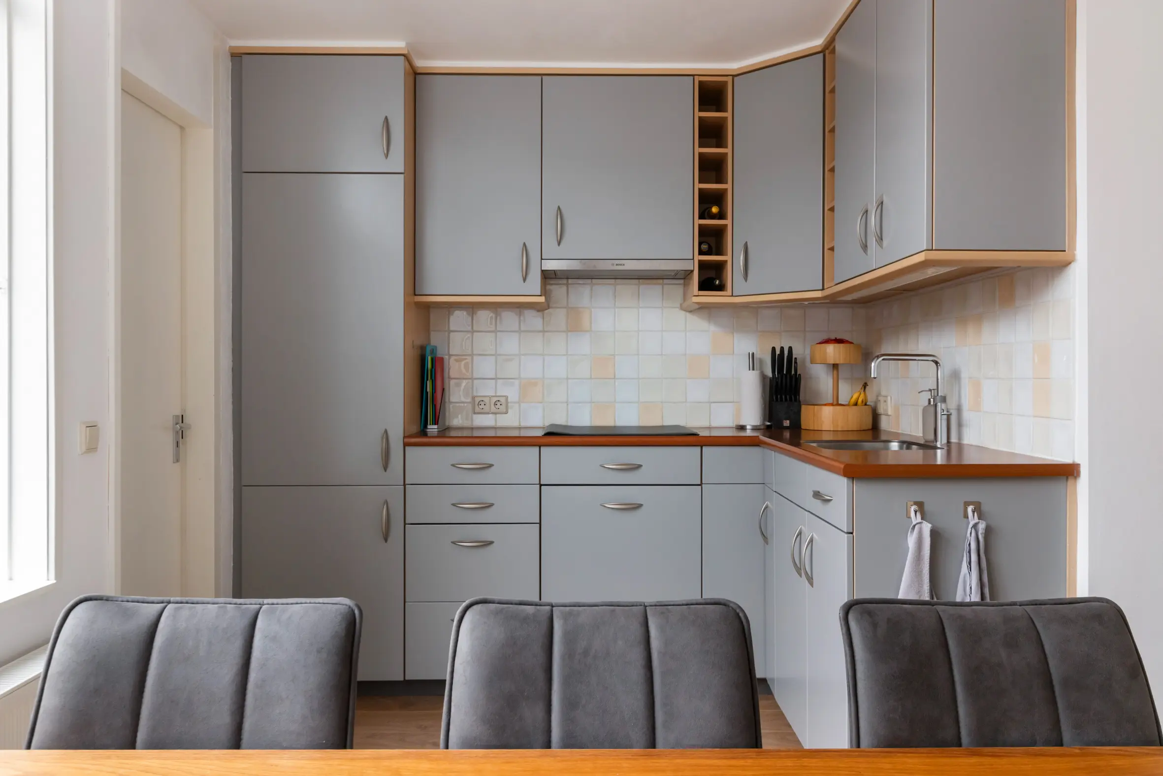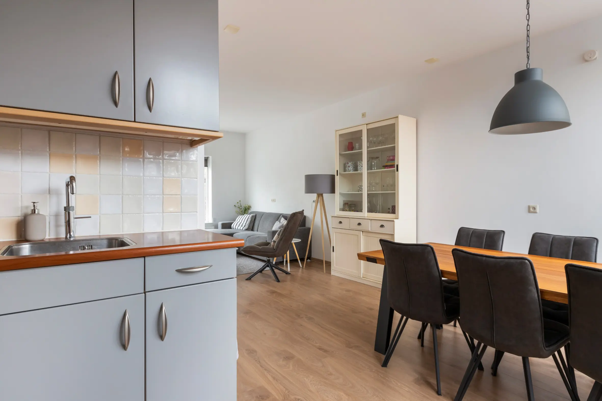 Vanuit de woonkamer is de open keuken in hoekopstelling te bereiken. De keuken met grijze fronten is voorzien van een inductiekookplaat met afzuigkap en koel-/vriescombinatie. Vanuit de open keuken is de praktische bijkeuken te bereiken. Hier bevindt zich de aansluiting voor de wasmachine en droger. De gefundeerde bijkeuken is bij opbouw compleet vernieuwd, geïsoleerd en bekleed met onderhoudsvrij keralit.