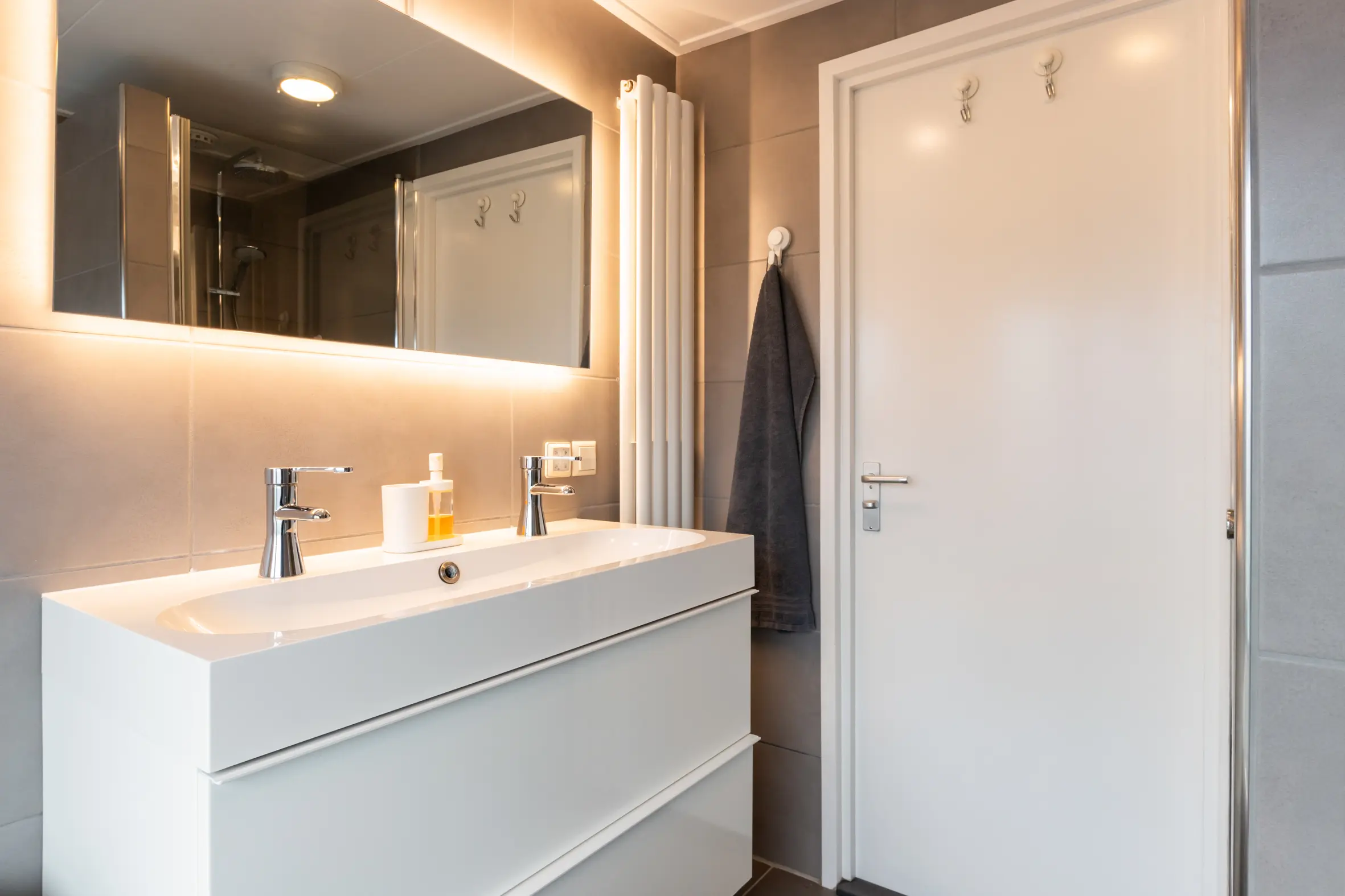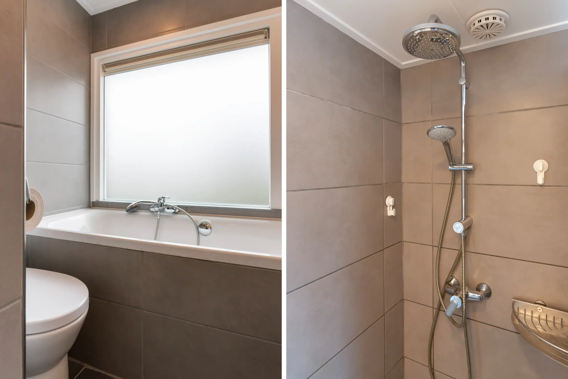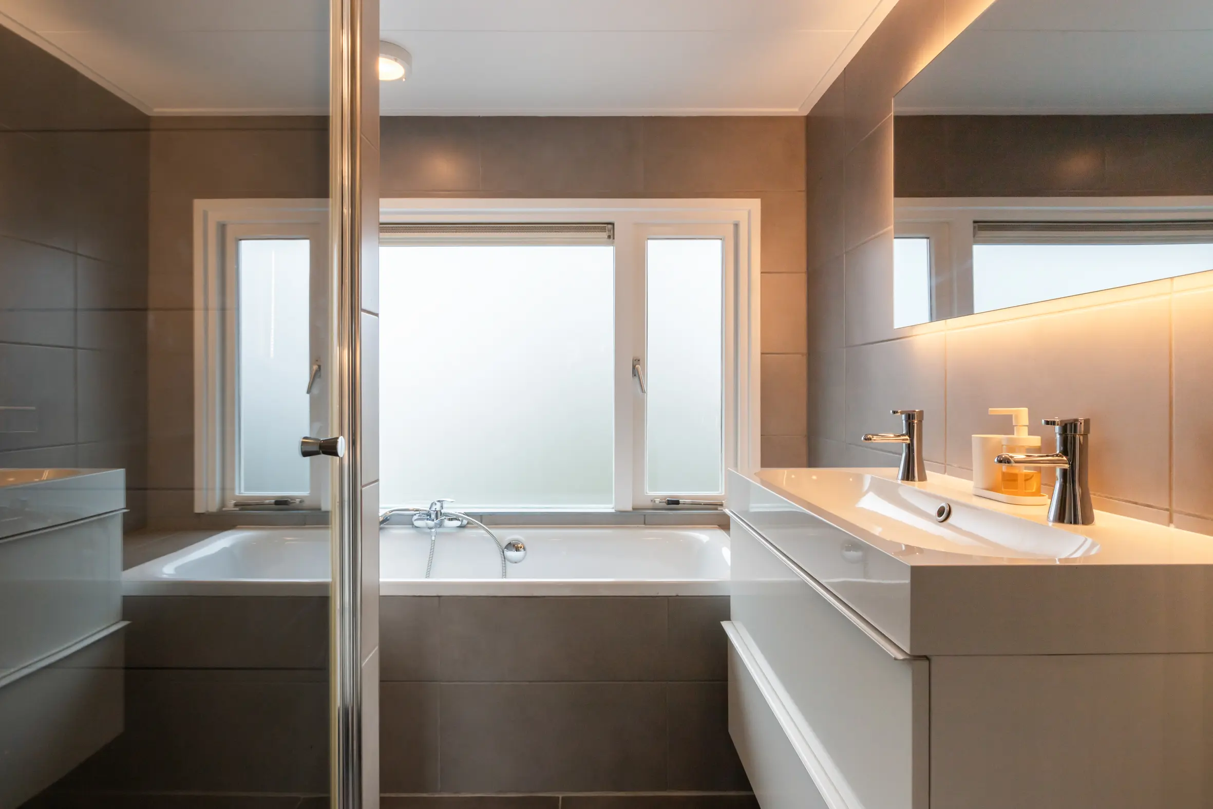 De vernieuwde en moderne badkamer is vergroot en is afgewerkt met een fraaie grijze betegeling gecombineerd met een wit wastafelmeubel met dubbele kraan. Verder is er een heerlijk ligbad, aparte douchegelegenheid met stortdouche, 2e toilet, designradiator en mechanische ventilatie.
