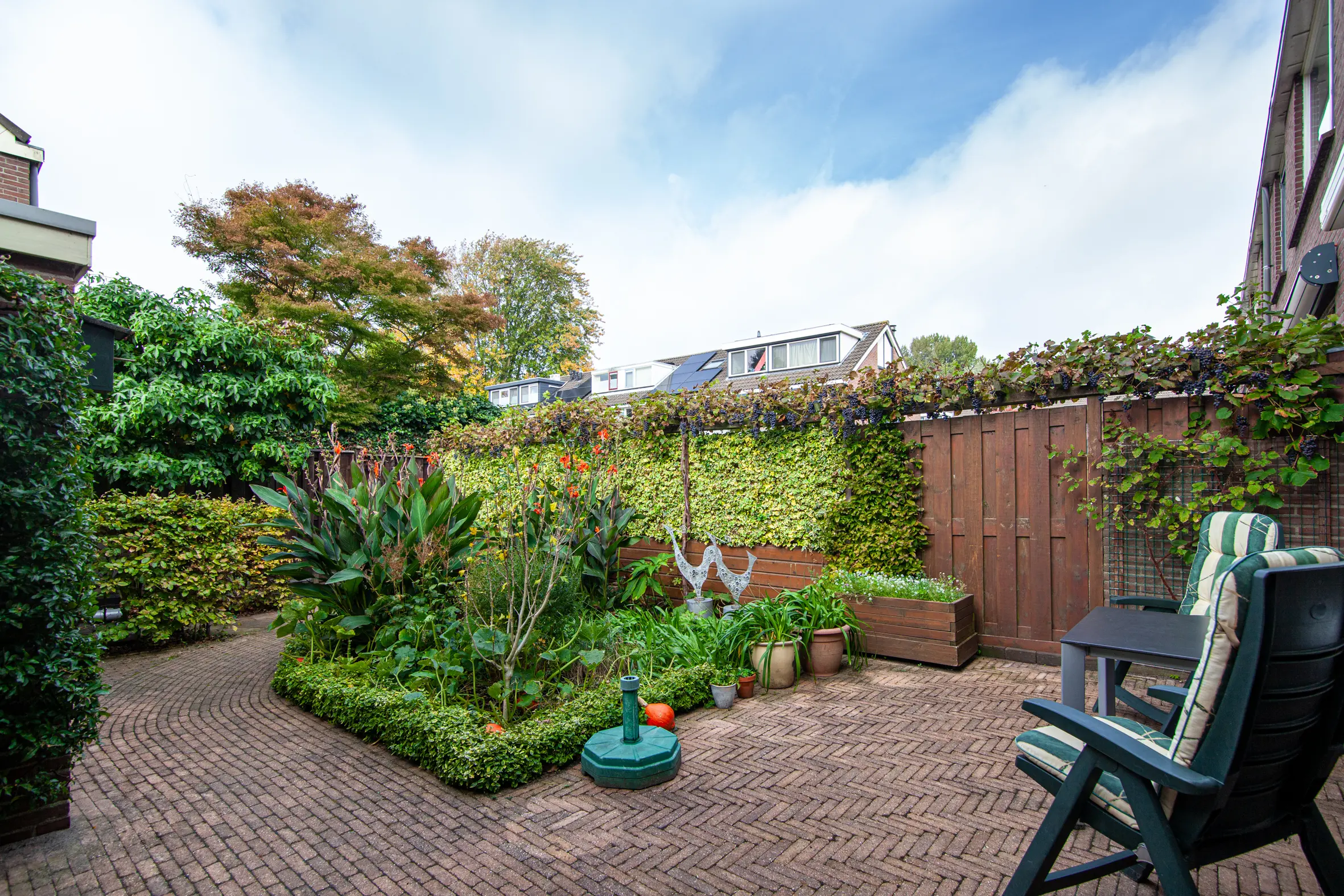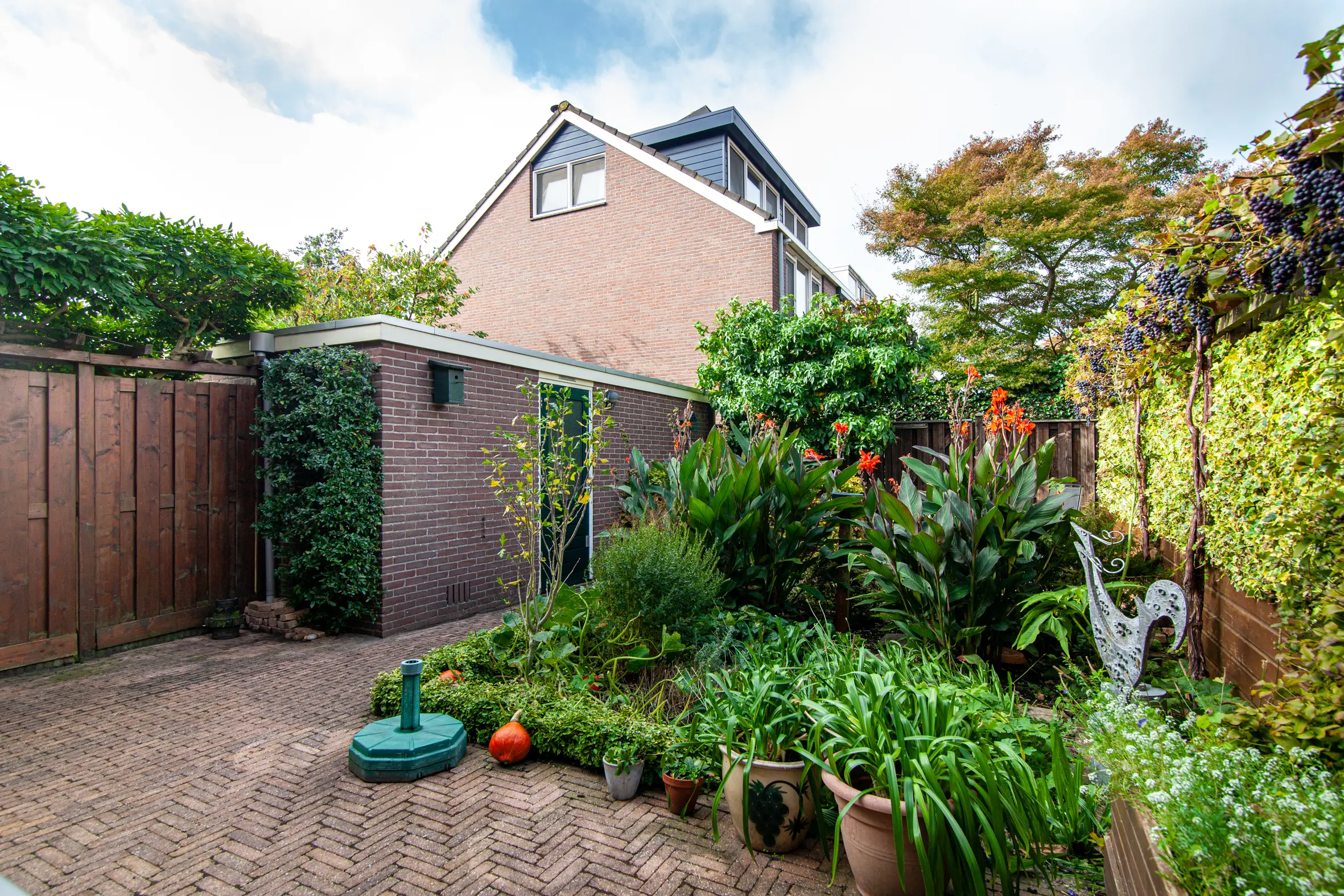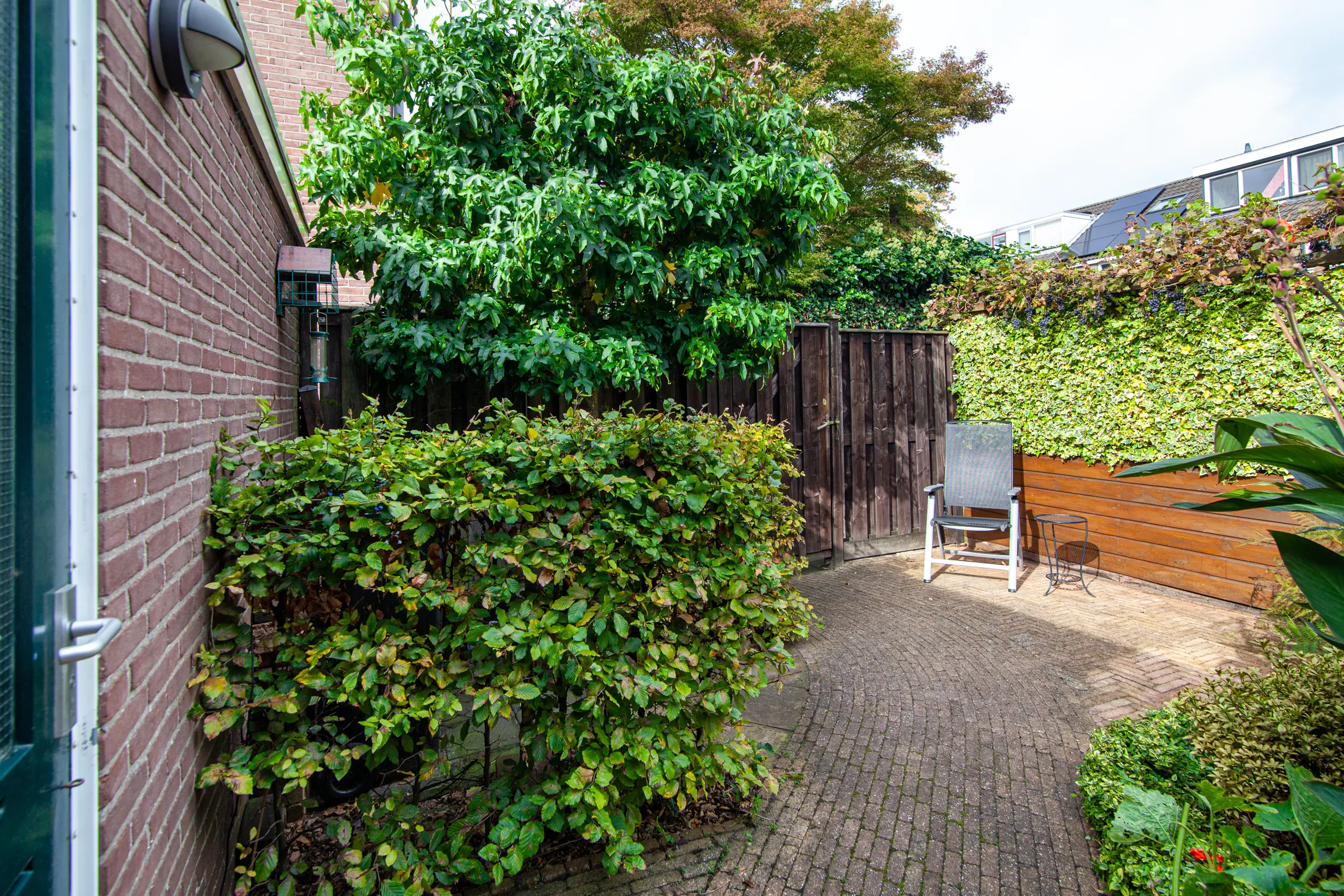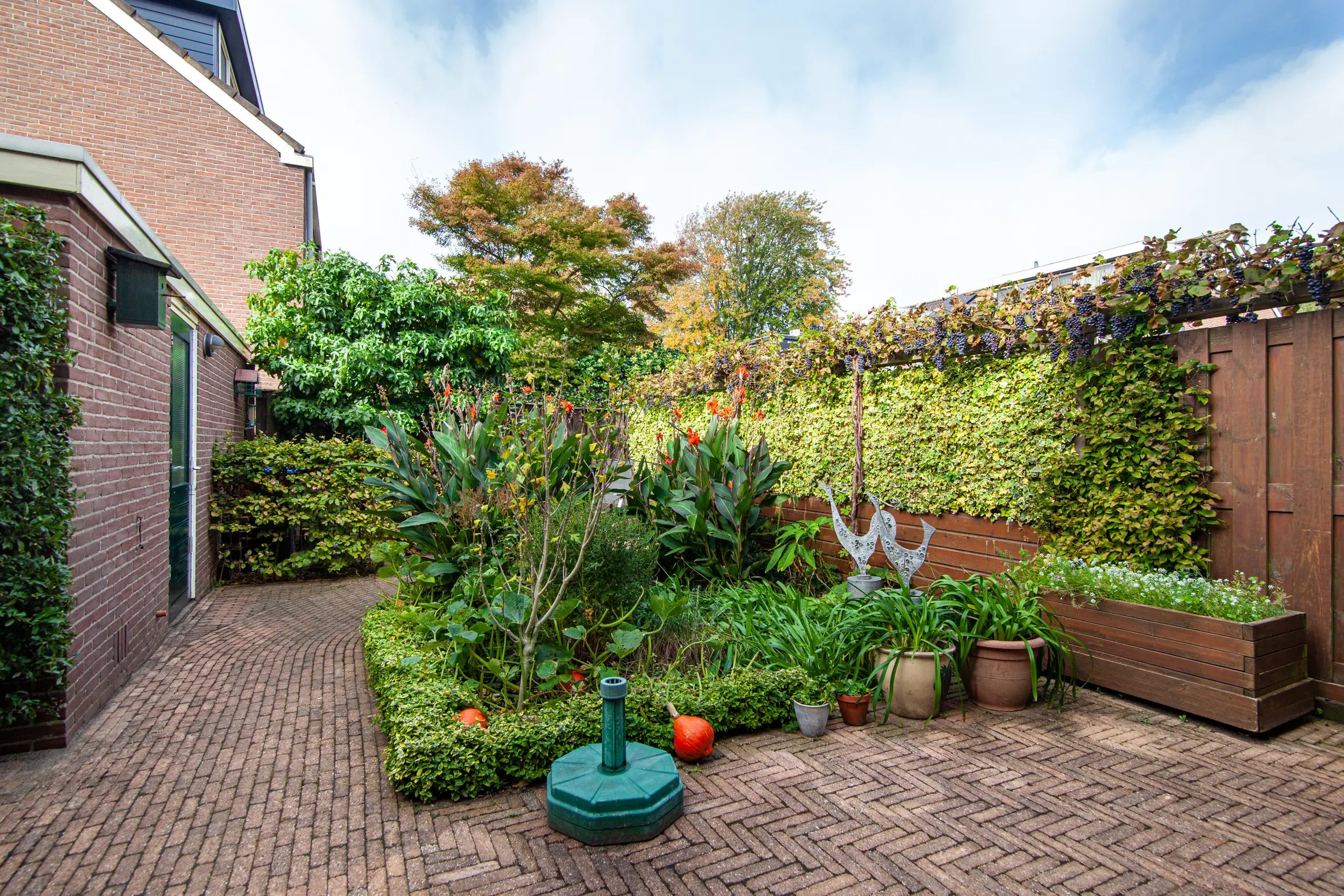 De achtertuin is ca. 10 meter diep en ligt op het westen, waardoor je hier volop van de middag- en avondzon kunt genieten. Dankzij het zonnescherm aan de achtergevel is er ook altijd een plek met schaduw te vinden. De tuin is groen en sfeervol aangelegd met een combinatie van beplanting en bestrating. Achterin bevindt zich een stenen berging, voorzien van elektra, en een handige buitenkraan. Via het achterom bereik je eenvoudig het achterpad, ideaal voor de fiets of het tuinonderhoud.