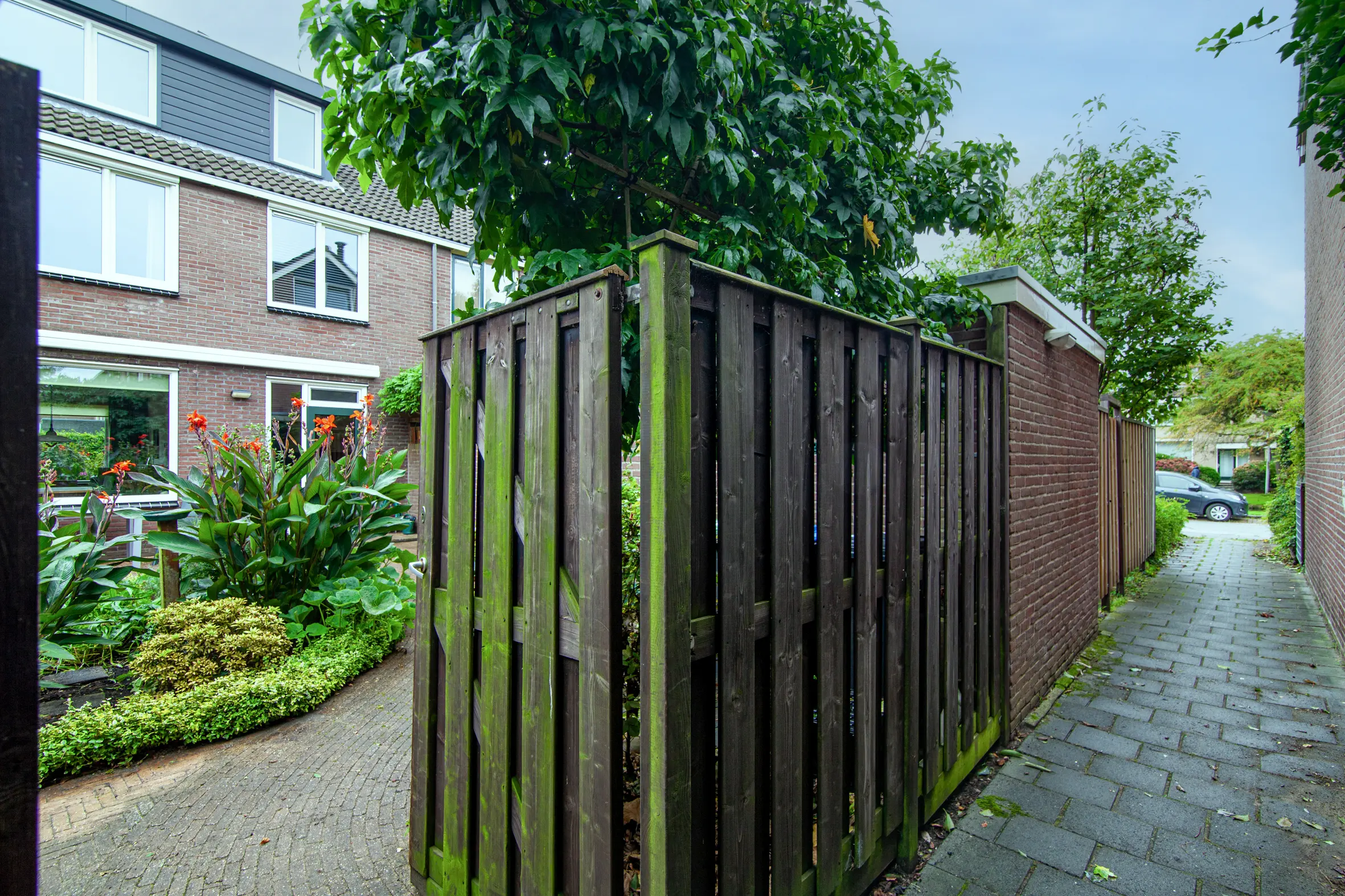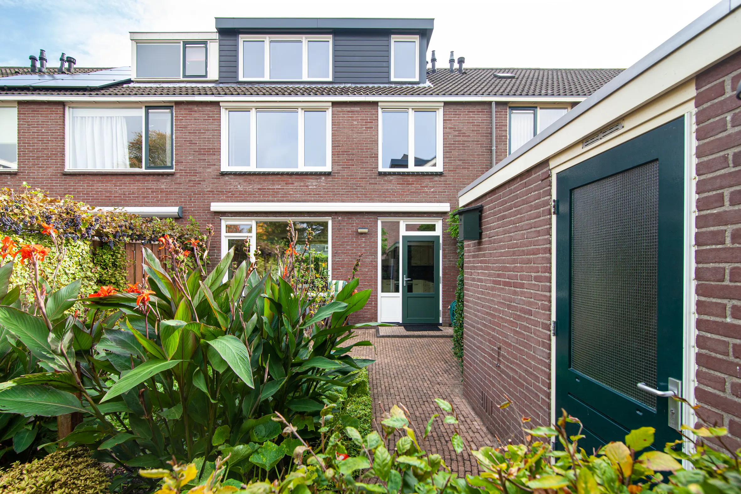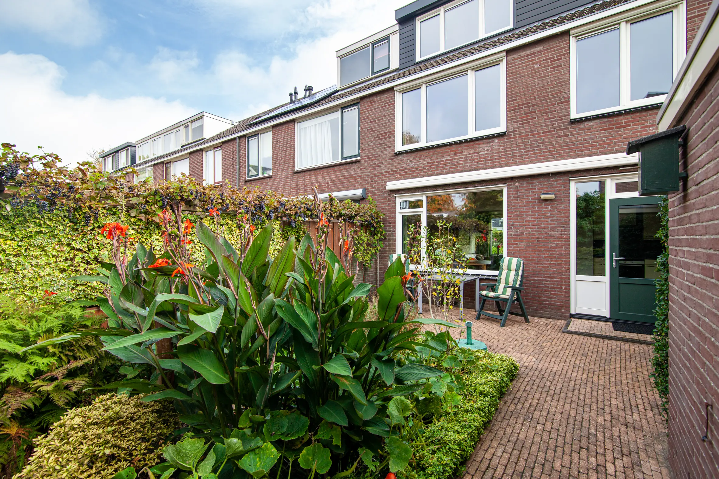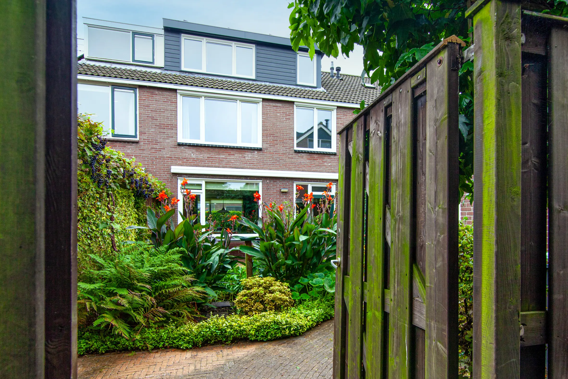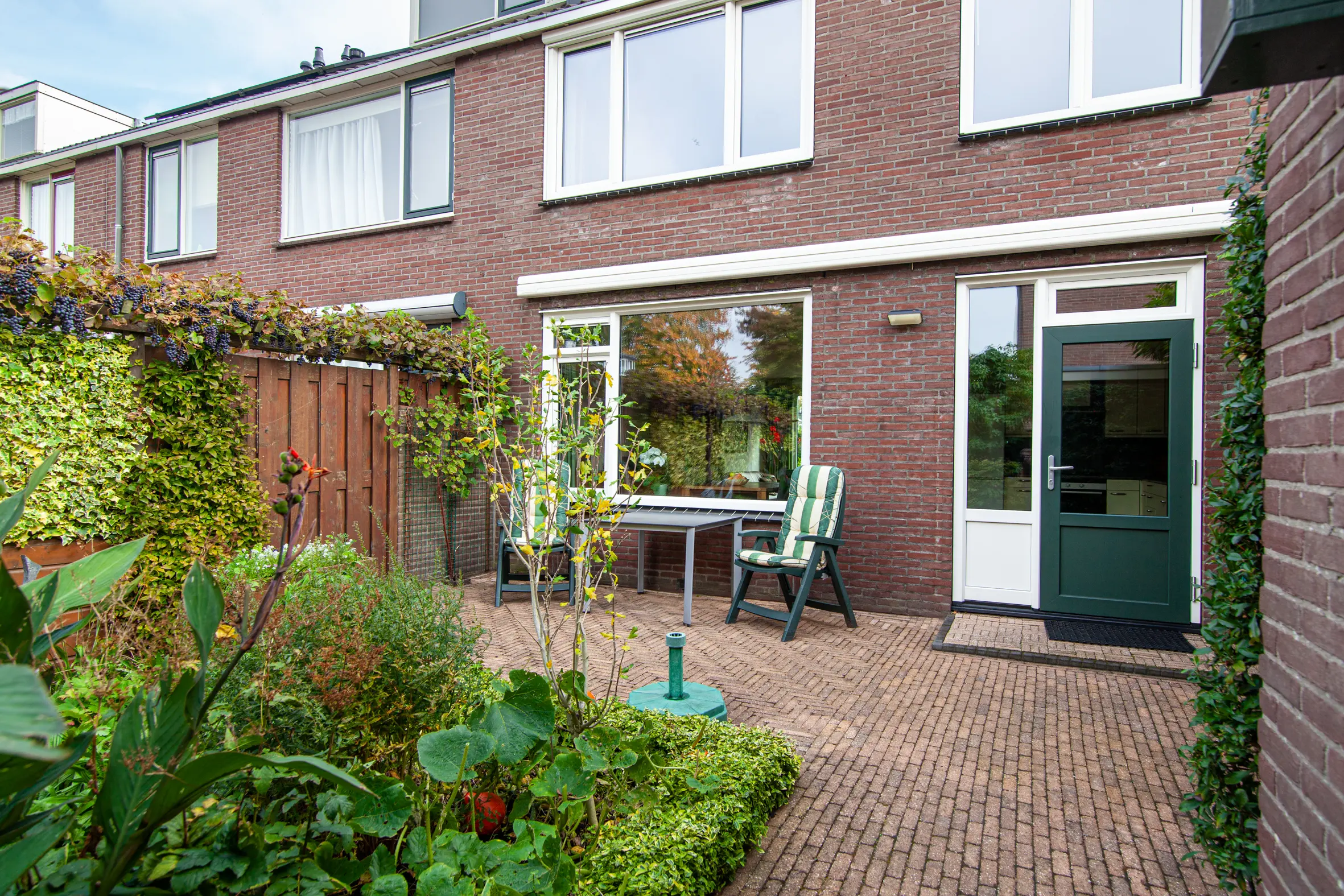 De achtertuin is ca. 10 meter diep en ligt op het westen, waardoor je hier volop van de middag- en avondzon kunt genieten. Dankzij het zonnescherm aan de achtergevel is er ook altijd een plek met schaduw te vinden. De tuin is groen en sfeervol aangelegd met een combinatie van beplanting en bestrating. Achterin bevindt zich een stenen berging, voorzien van elektra, en een handige buitenkraan. Via het achterom bereik je eenvoudig het achterpad, ideaal voor de fiets of het tuinonderhoud.