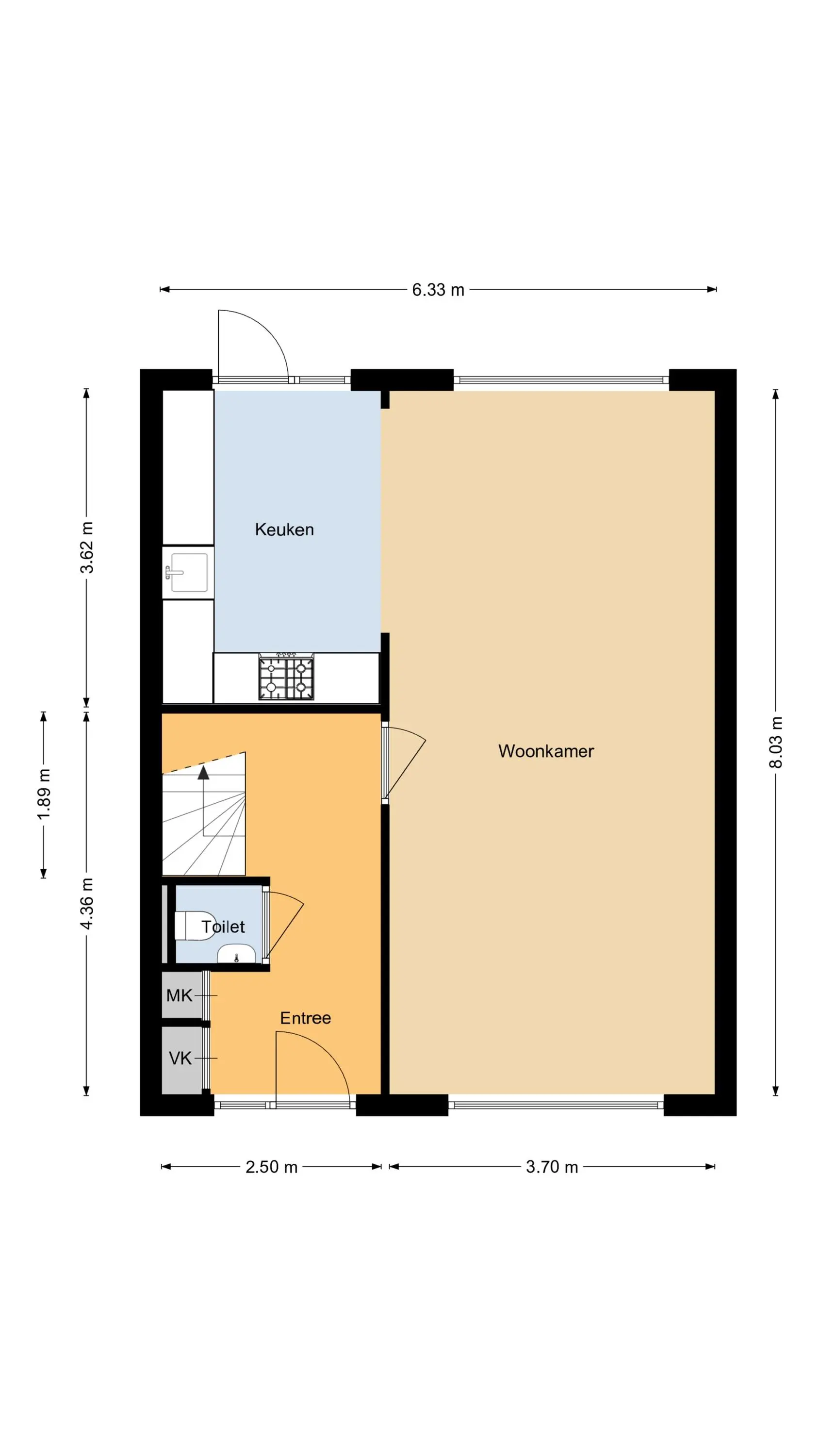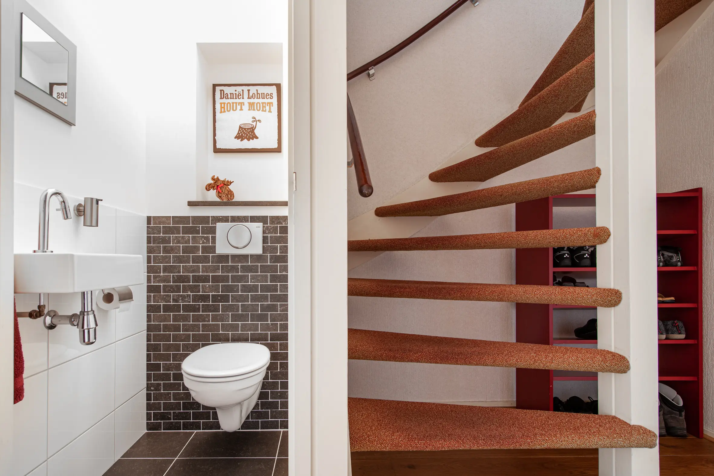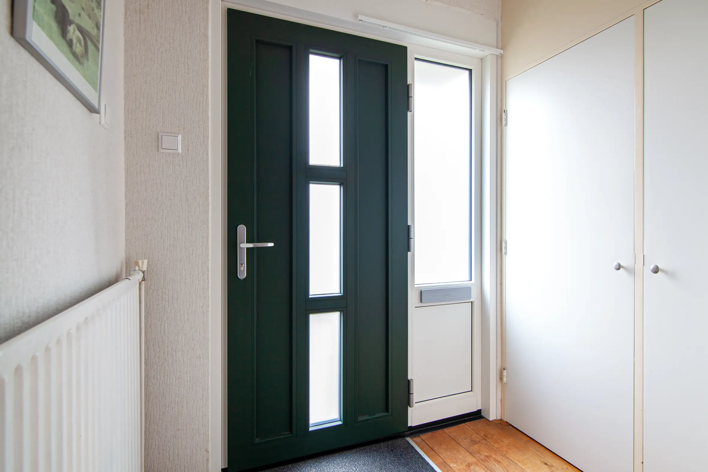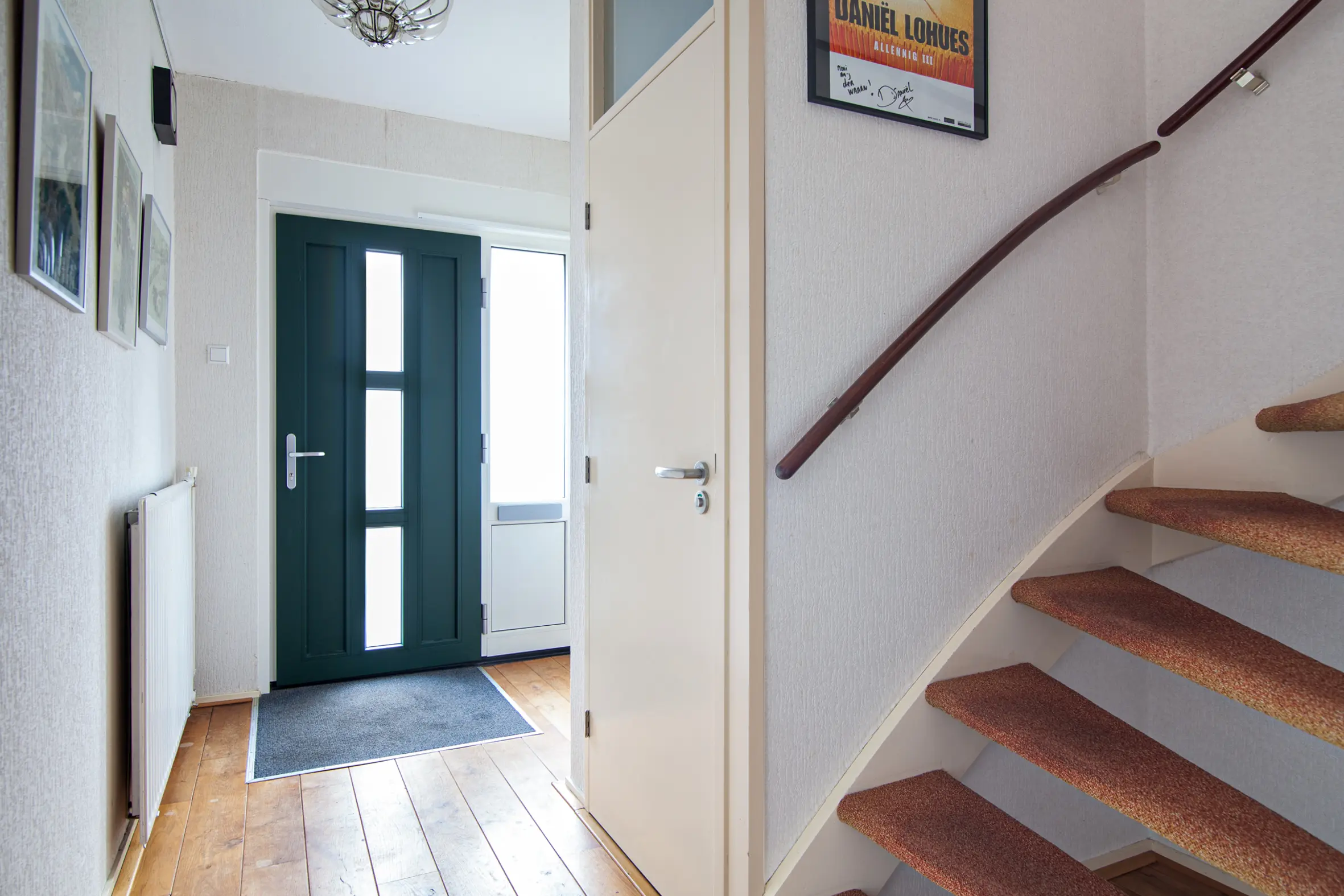De voortuin is verzorgd aangelegd en biedt toegang tot de entree van de woning. De hal is ruim opgezet en beschikt over een meterkast (2023) met omvormer voor de zonnepanelen, garderobekast, nette toiletruimte met fonteintje en een open trap. Via de hal kom je uit in de woonkamer en keuken.