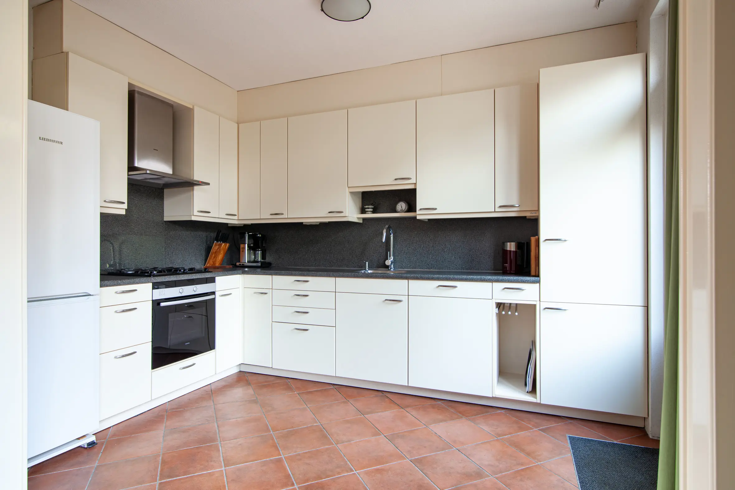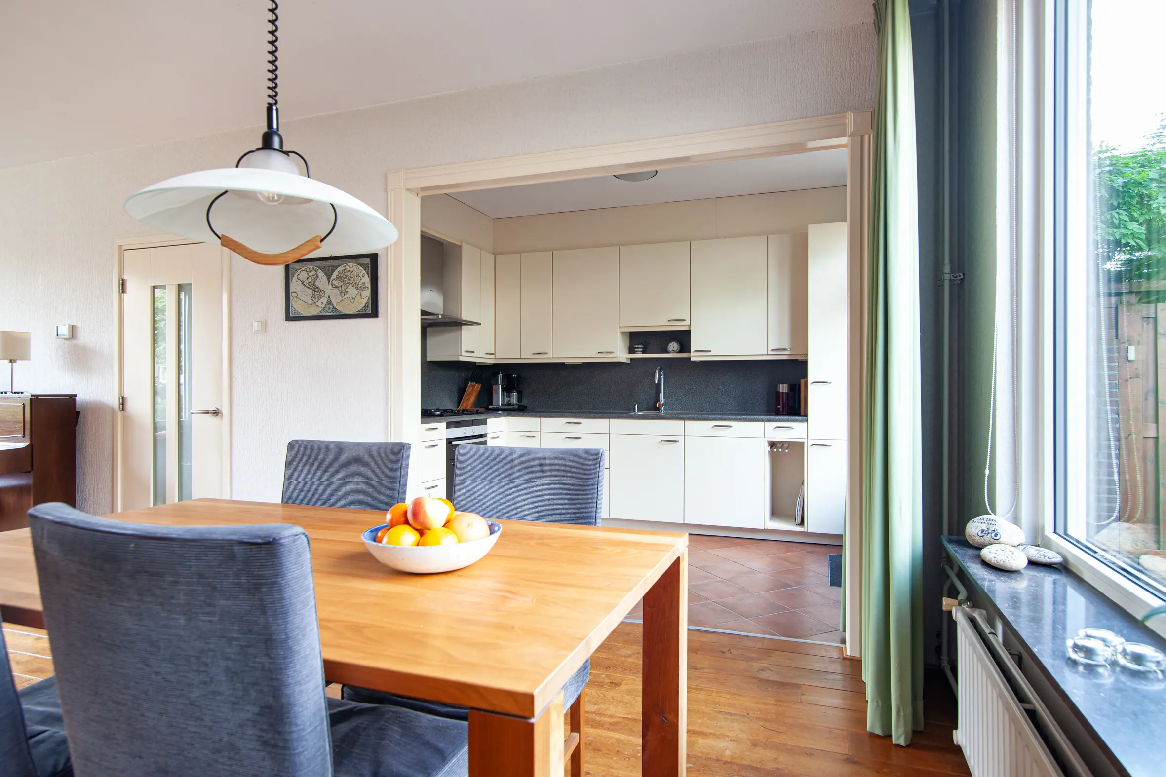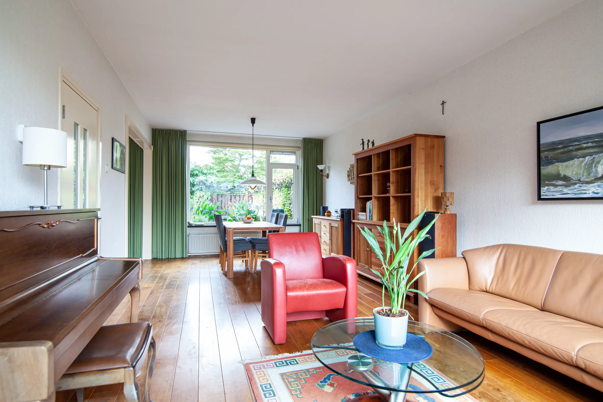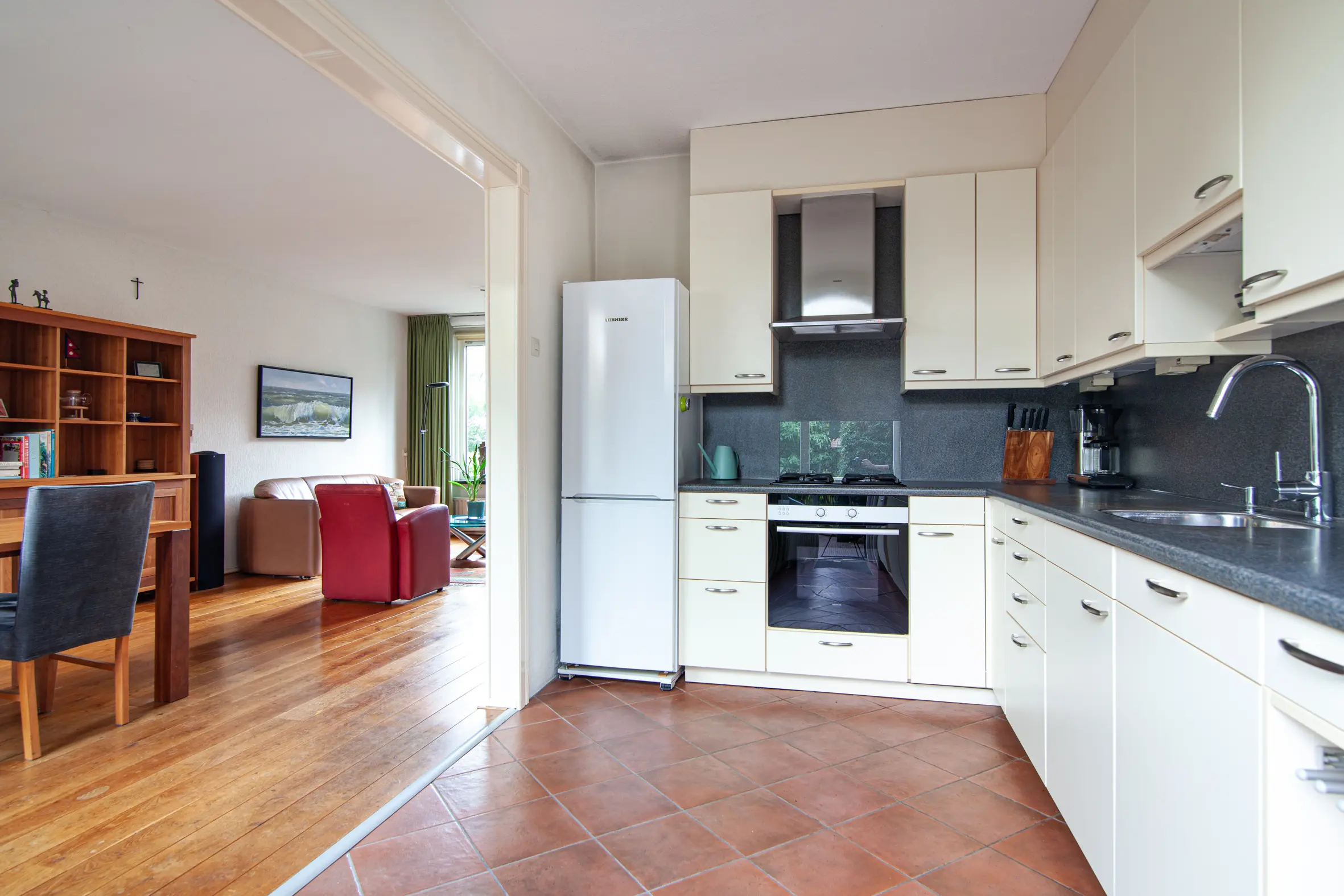 De woonkamer strekt zich uit over de volledige lengte van de woning. Dankzij de royale raampartijen aan zowel de voor- als achterzijde valt er veel daglicht naar binnen. Er is volop ruimte voor zowel een zit- als eethoek. Aan de achterzijde loopt de woonkamer over in de open keuken, die in een praktische hoekopstelling is geplaatst en veel werk- en opbergruimte biedt. De keuken is uitgerust met diverse (inbouw)apparatuur: