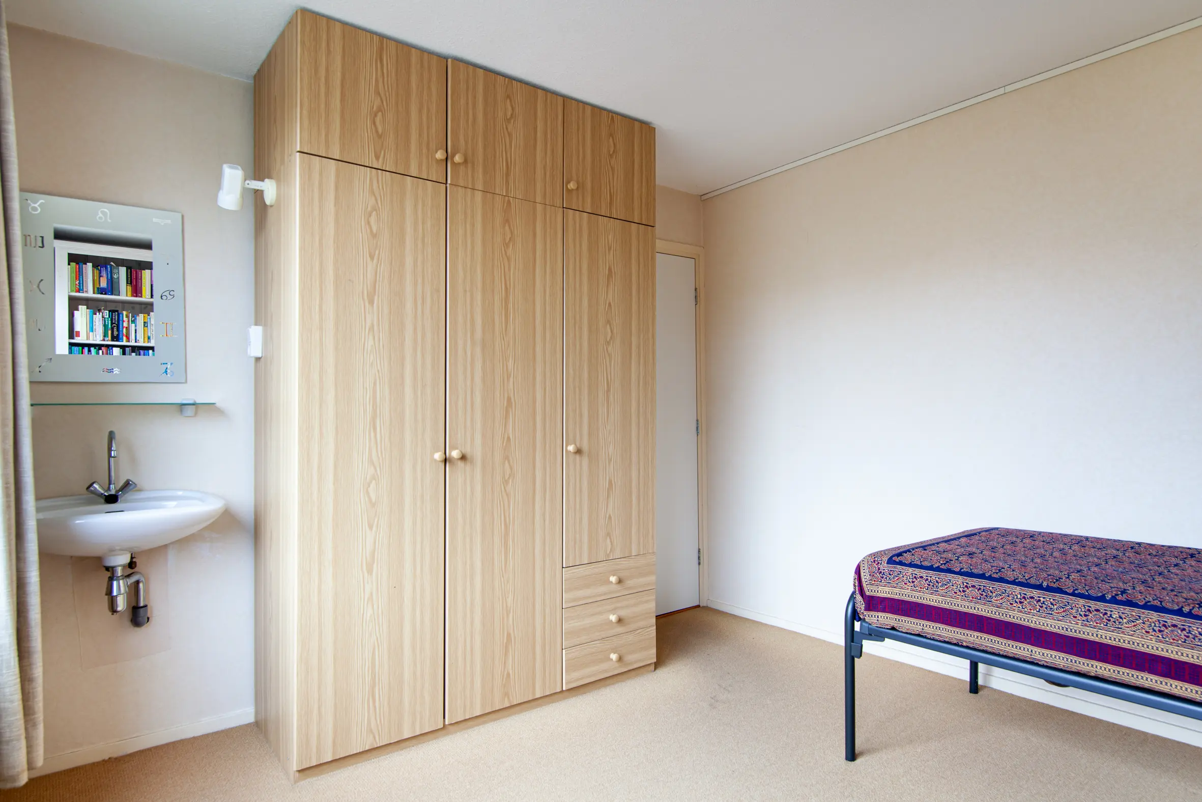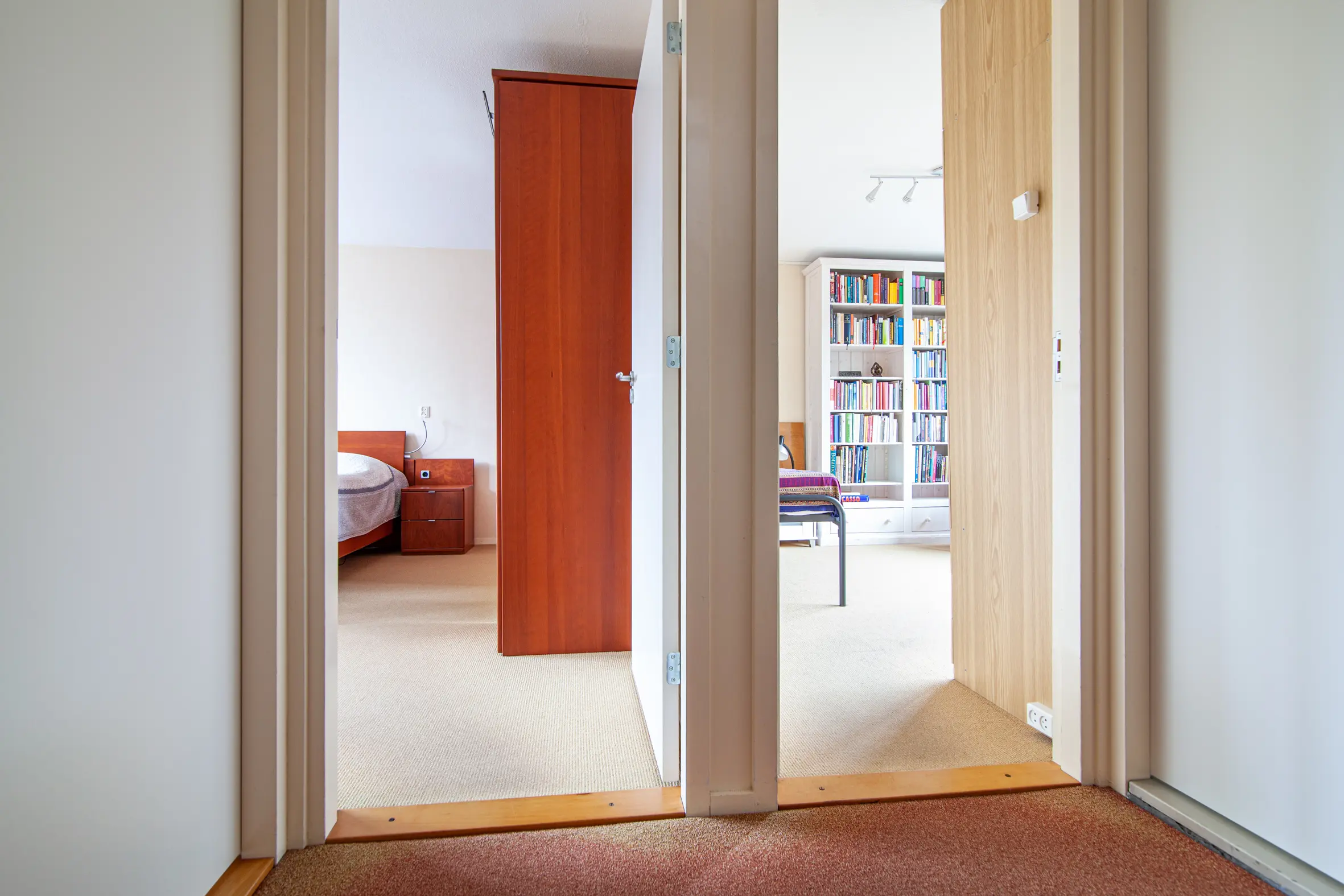 De eerste slaapkamer van ca. 12 m² bevindt zich aan de voorzijde en beschikt over een vaste wastafel. Aan de achterzijde liggen twee slaapkamers, waarvan één met een royaal formaat van ca. 17 m². Alle slaapkamers zijn voorzien van vloerbedekking en de wanden zijn afgewerkt met behang. Daarnaast beschikken de kamers over elektrisch bedienbare screens.
