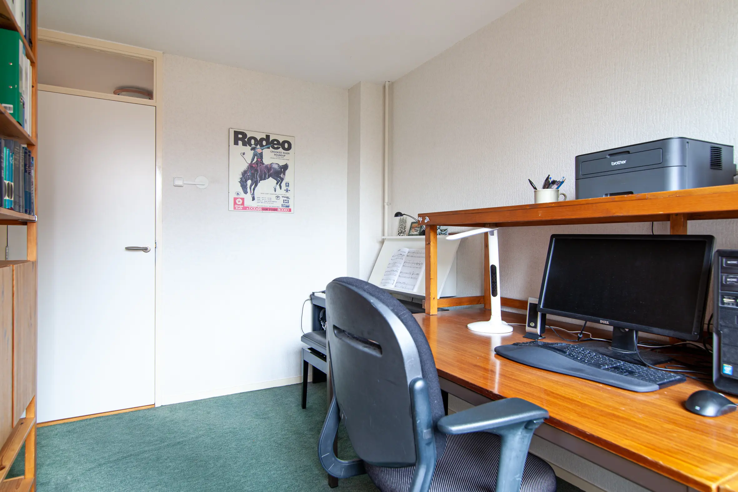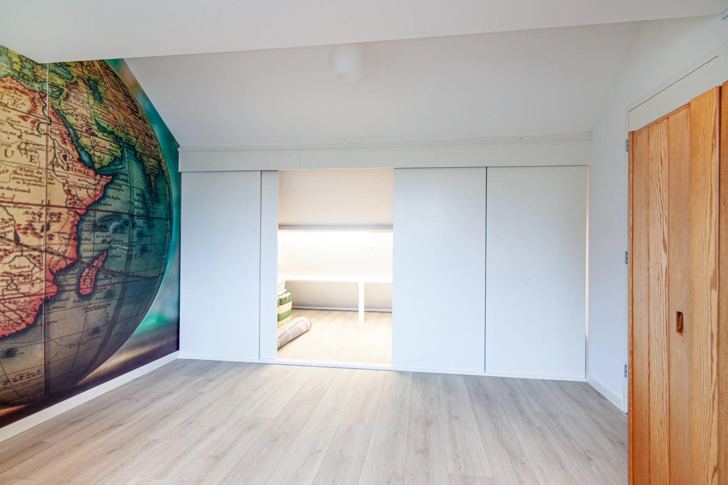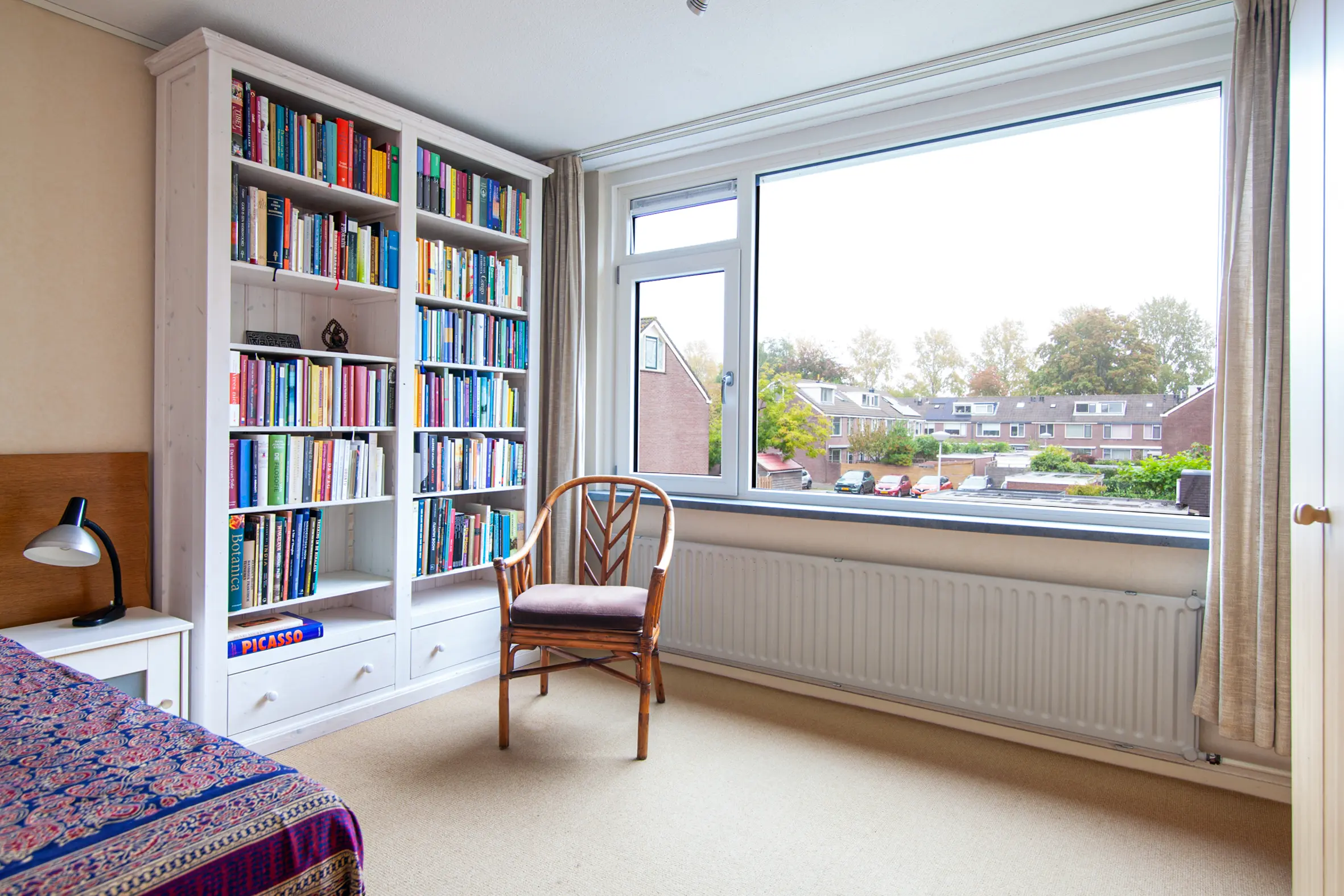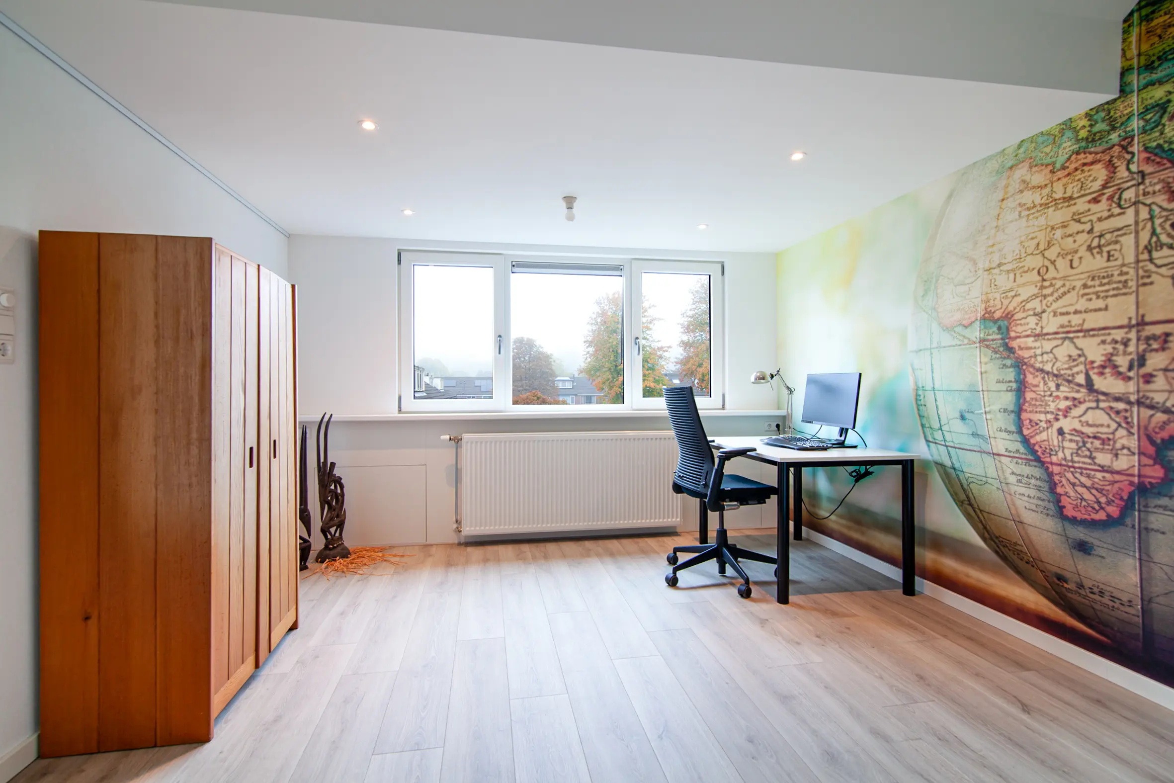 De vierde, zeer ruime slaapkamer is afgewerkt met een laminaatvloer, gestucte wanden en inbouwspots. Dankzij de royale dakkapel is ook deze (slaap)kamer heerlijk licht en biedt het volop ruimte. Achter de schuifpanelen vind je extra opbergruimte. Indien gewenst kunnen hier eenvoudig twee aparte slaapkamers worden gerealiseerd. Kortom, een multifunctionele verdieping die meebeweegt met de woonwensen.