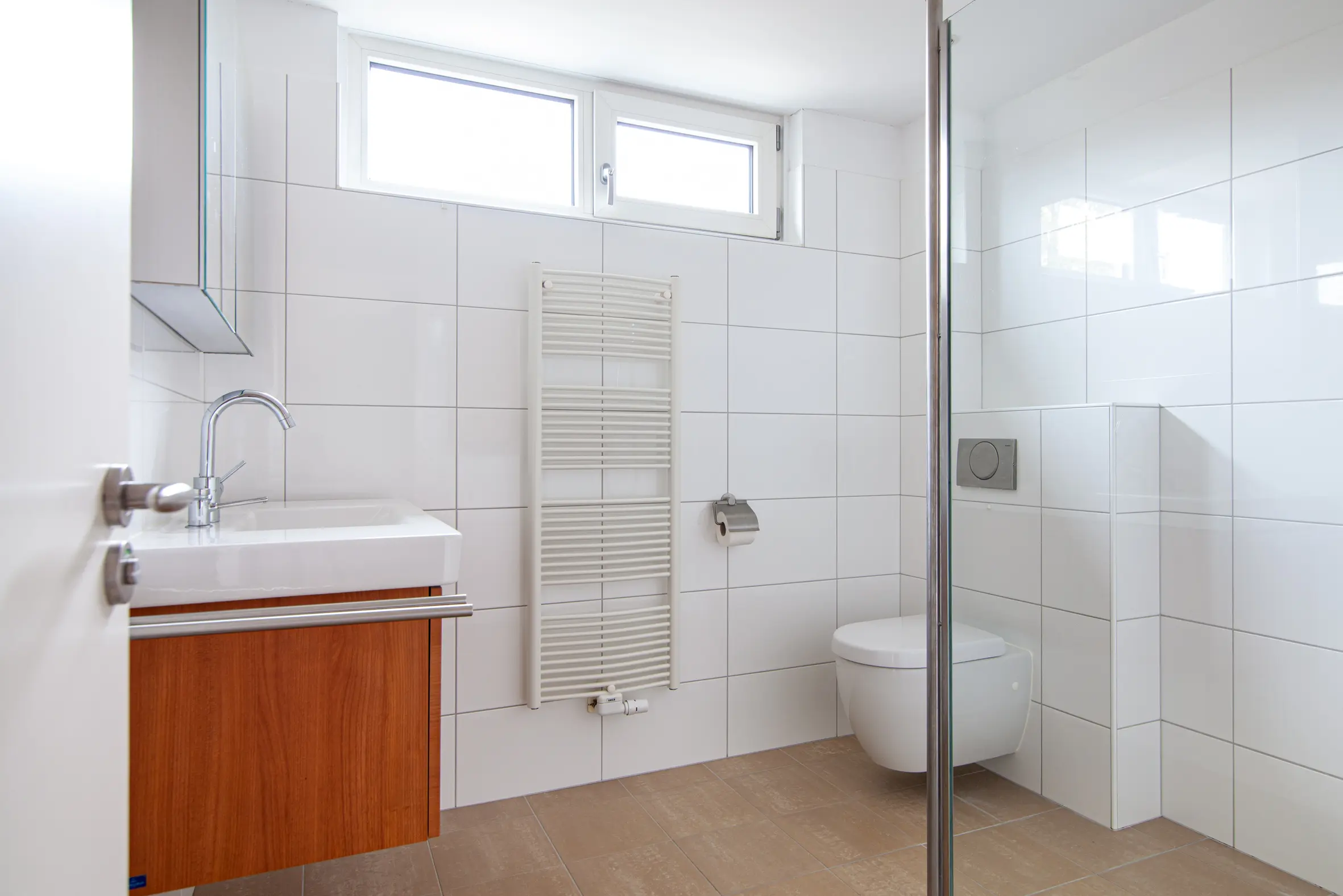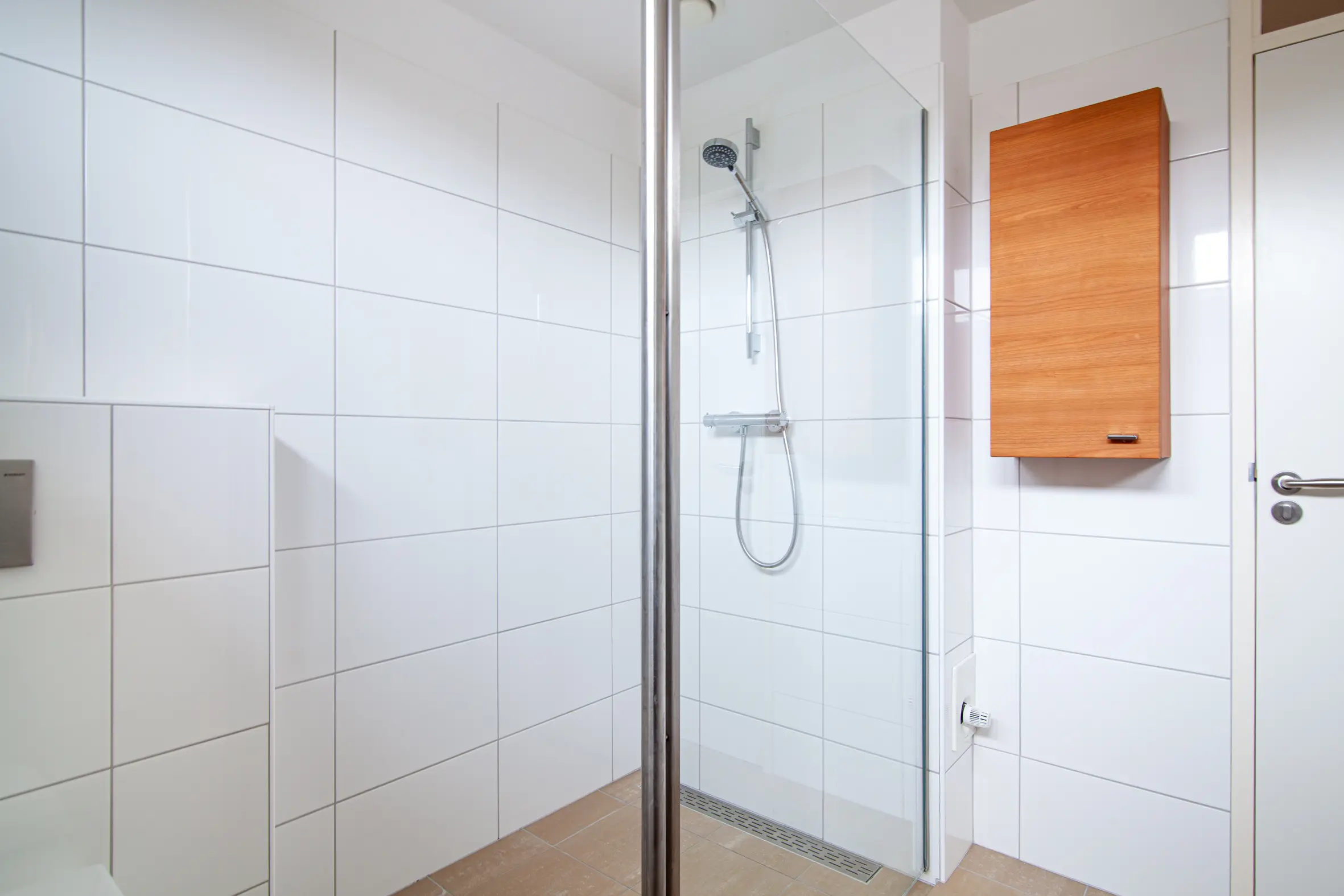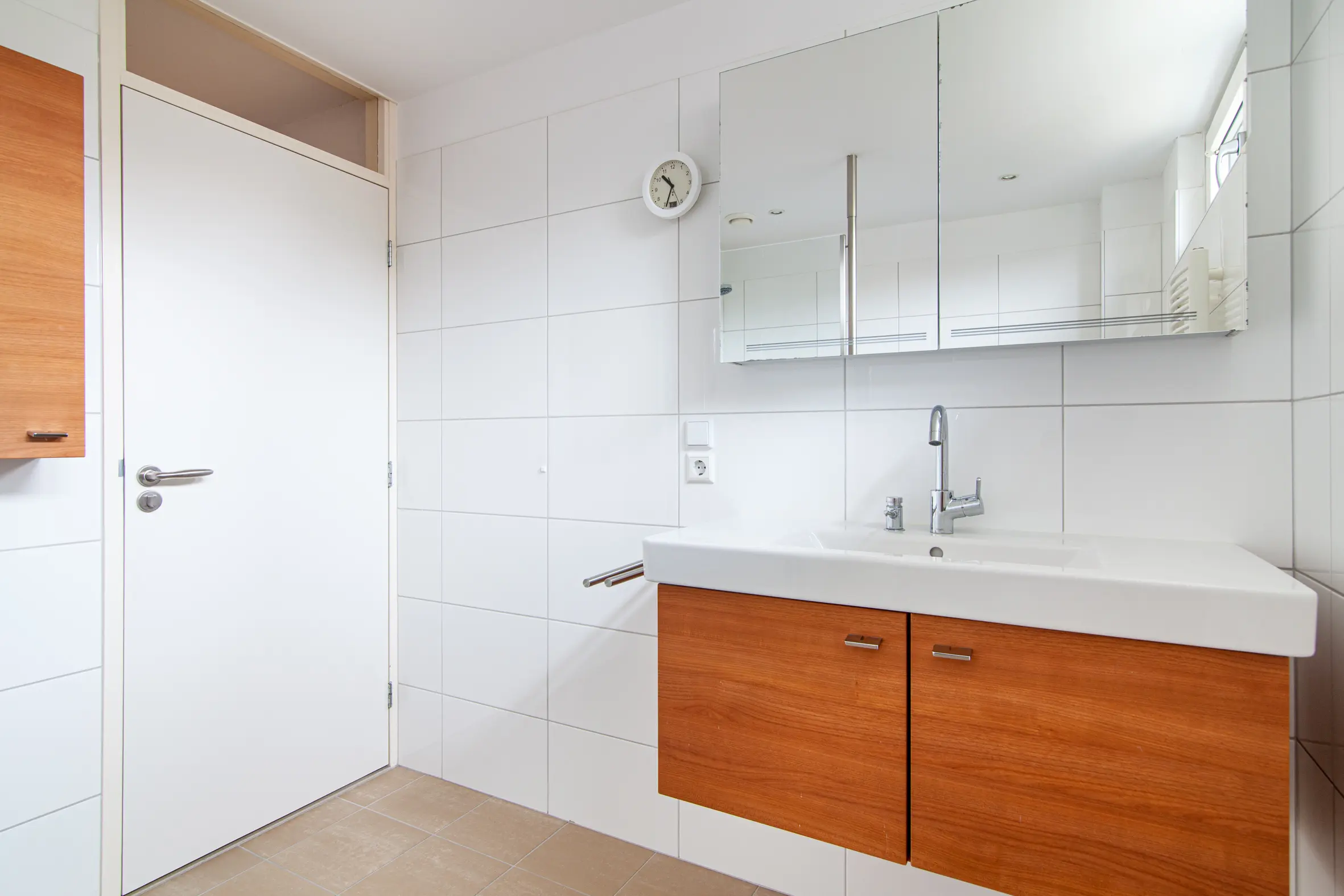 De badkamer is licht en netjes afgewerkt, beschikt over vloerverwarming en is voorzien van: