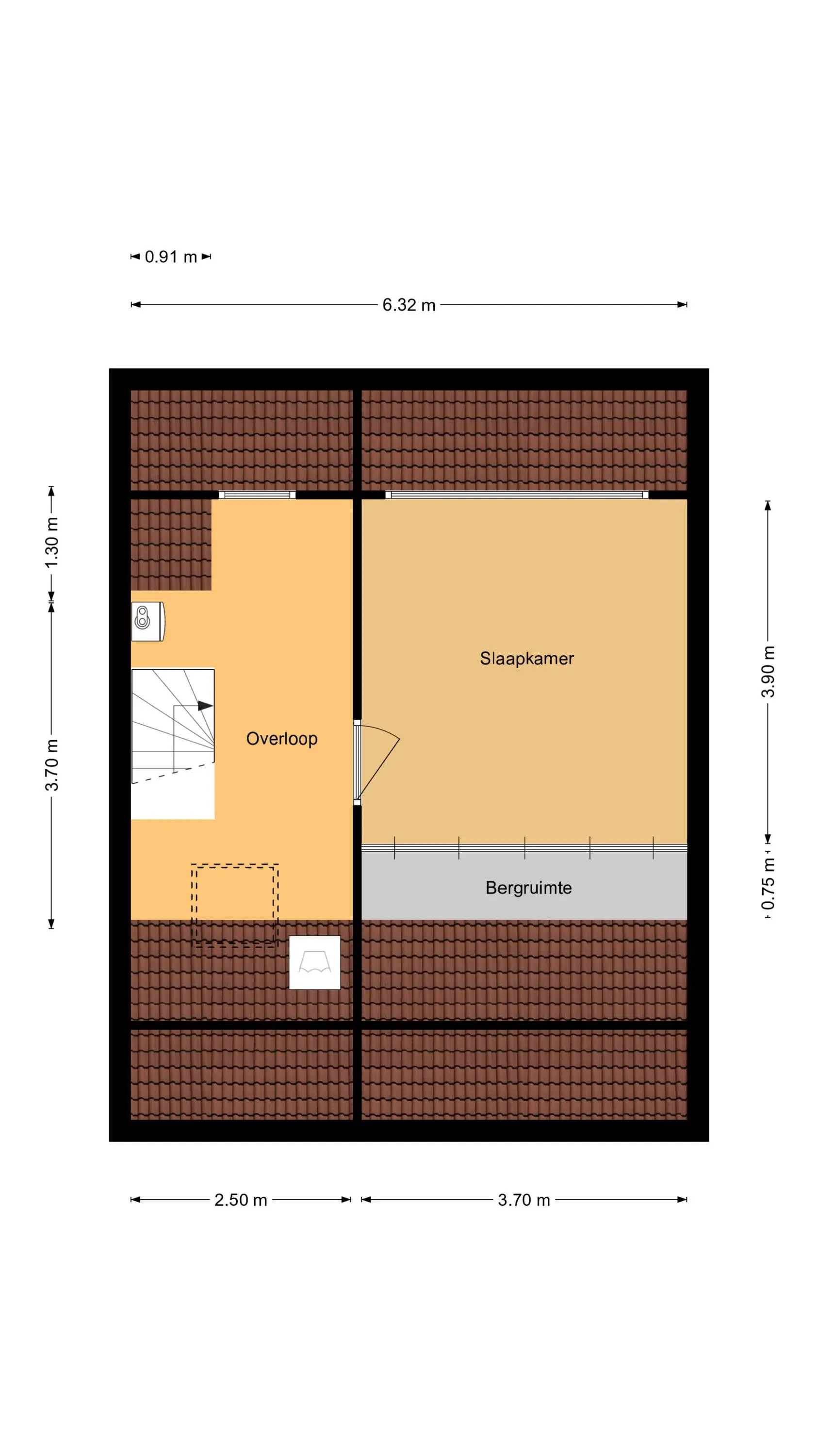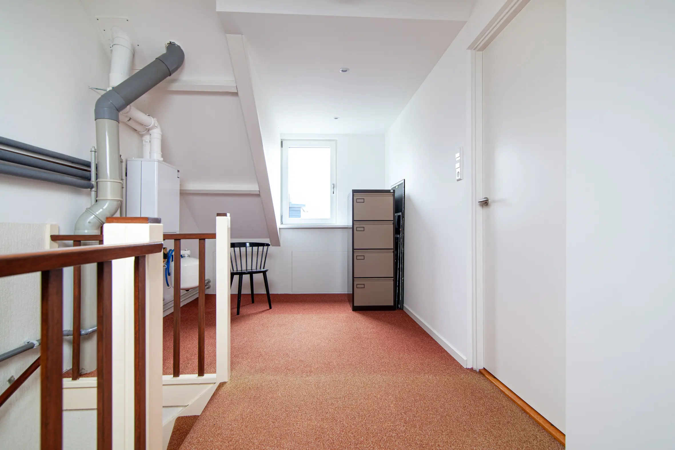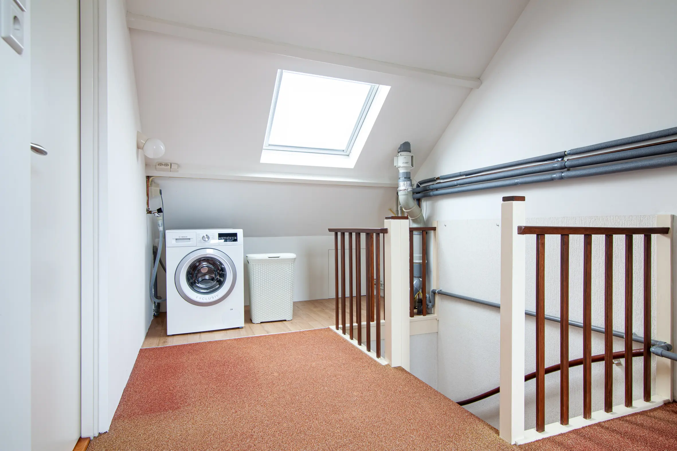 De tweede verdieping is verrassend ruim en praktisch ingedeeld. Via de vaste trap kom je op de ruime overloop. Hier valt het daglicht ruim voldoende naar binnen dankzij het Velux-dakraam aan de voorzijde en een gedeelte van de dakkapel aan de achterzijde. Daarnaast bevinden zich hier tevens de aansluitingen voor de wasmachine, de opstelplaats van de cv-ketel (Intergas, 2023) en extra bergruimte achter de knieschotten.