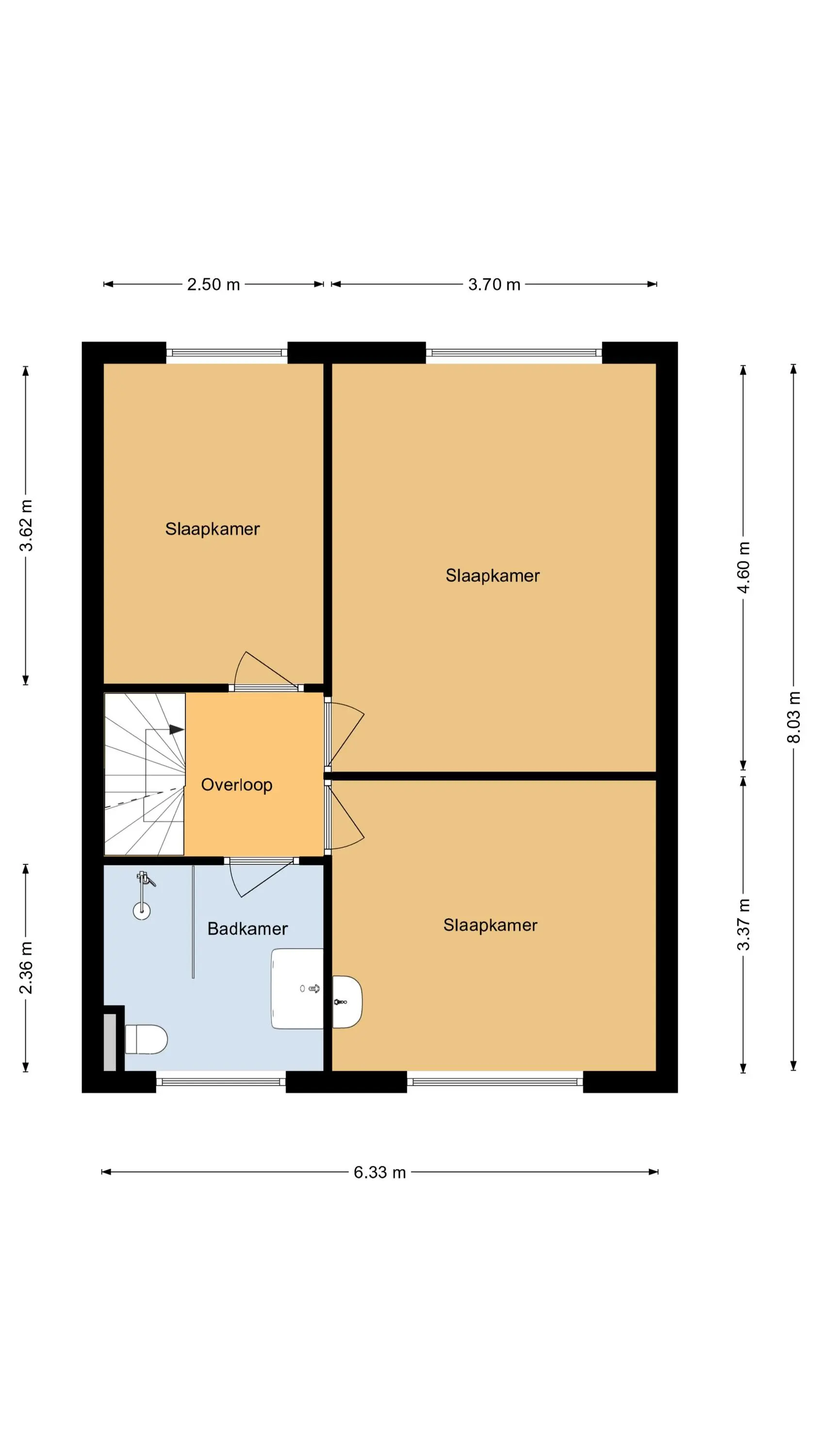 Overloop met toegang tot 3 ruime slaapkamers en badkamer.