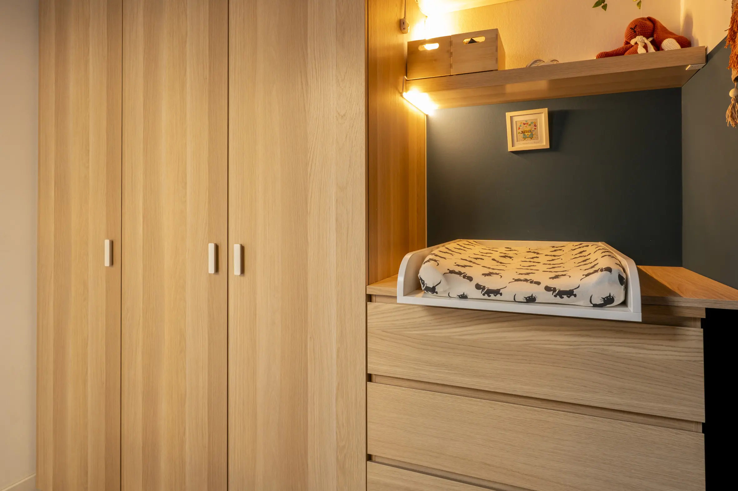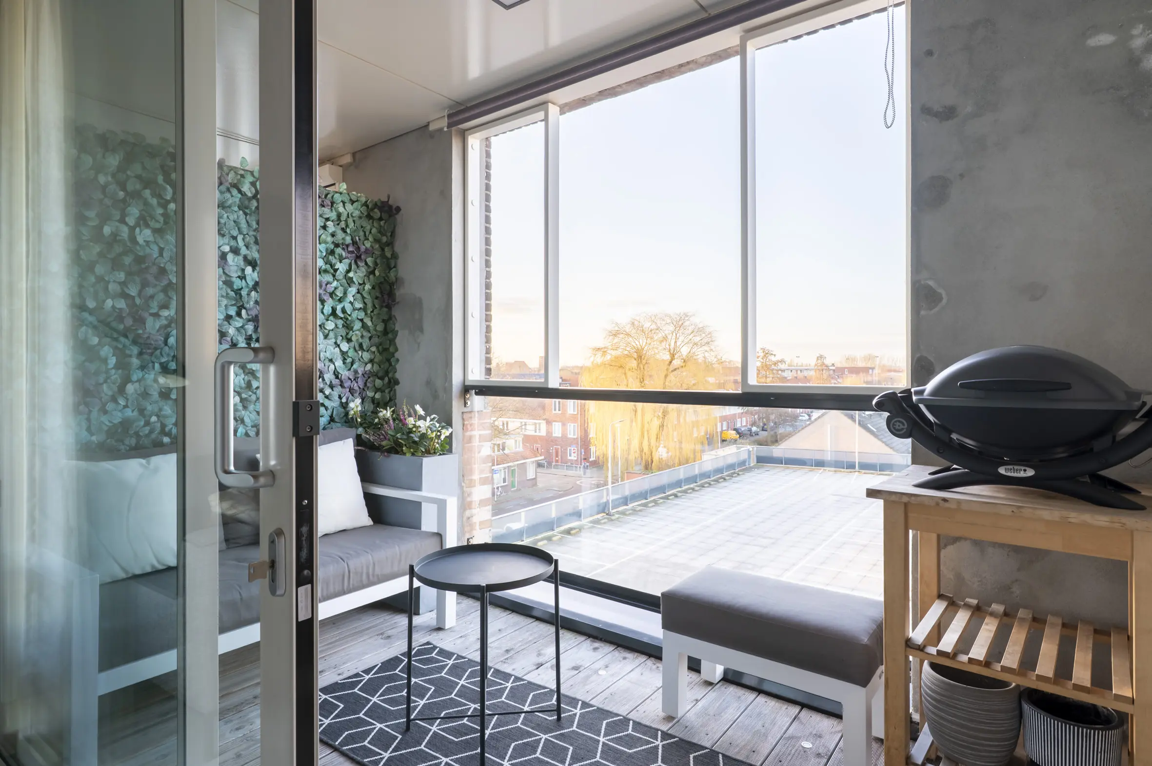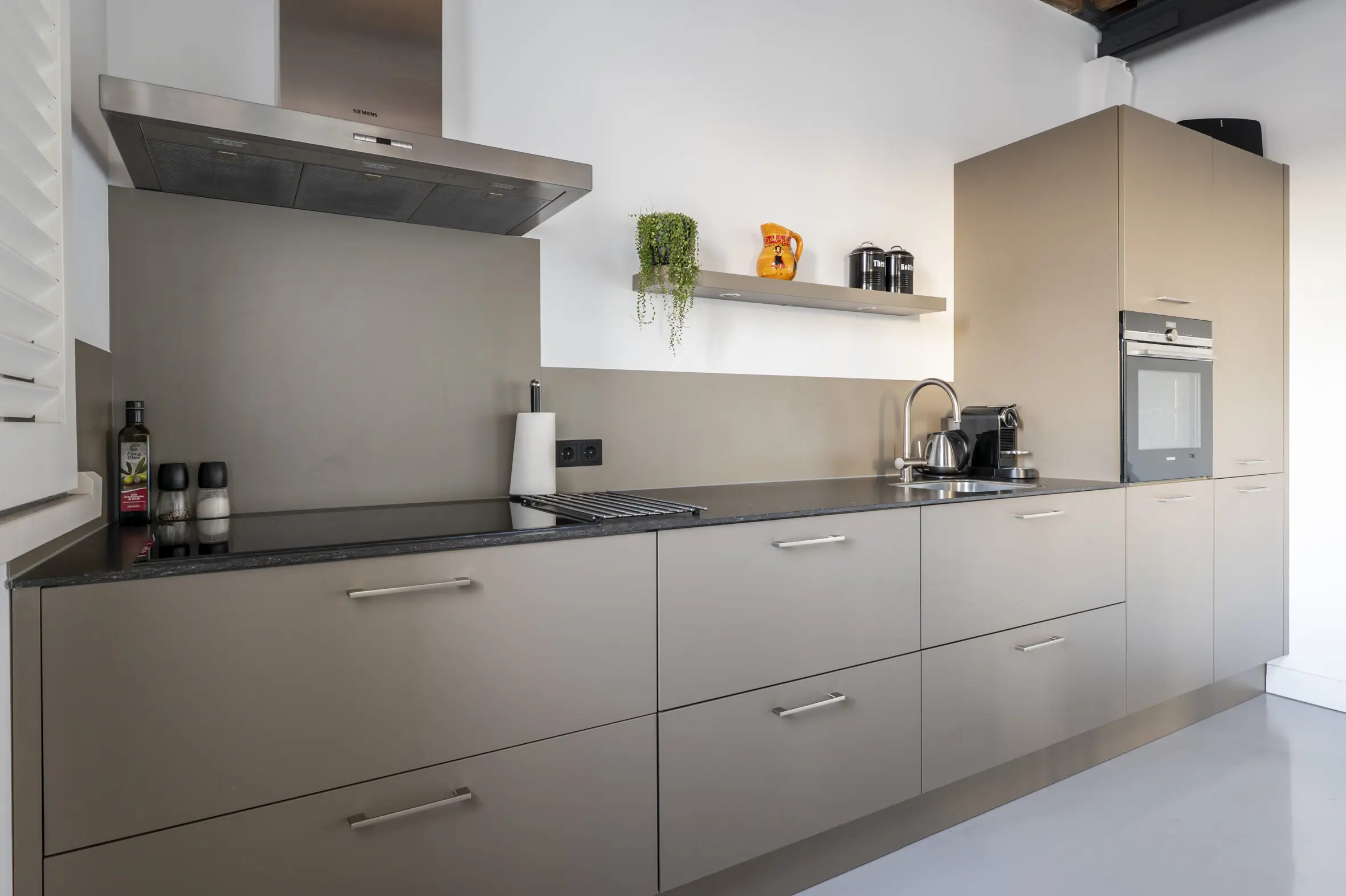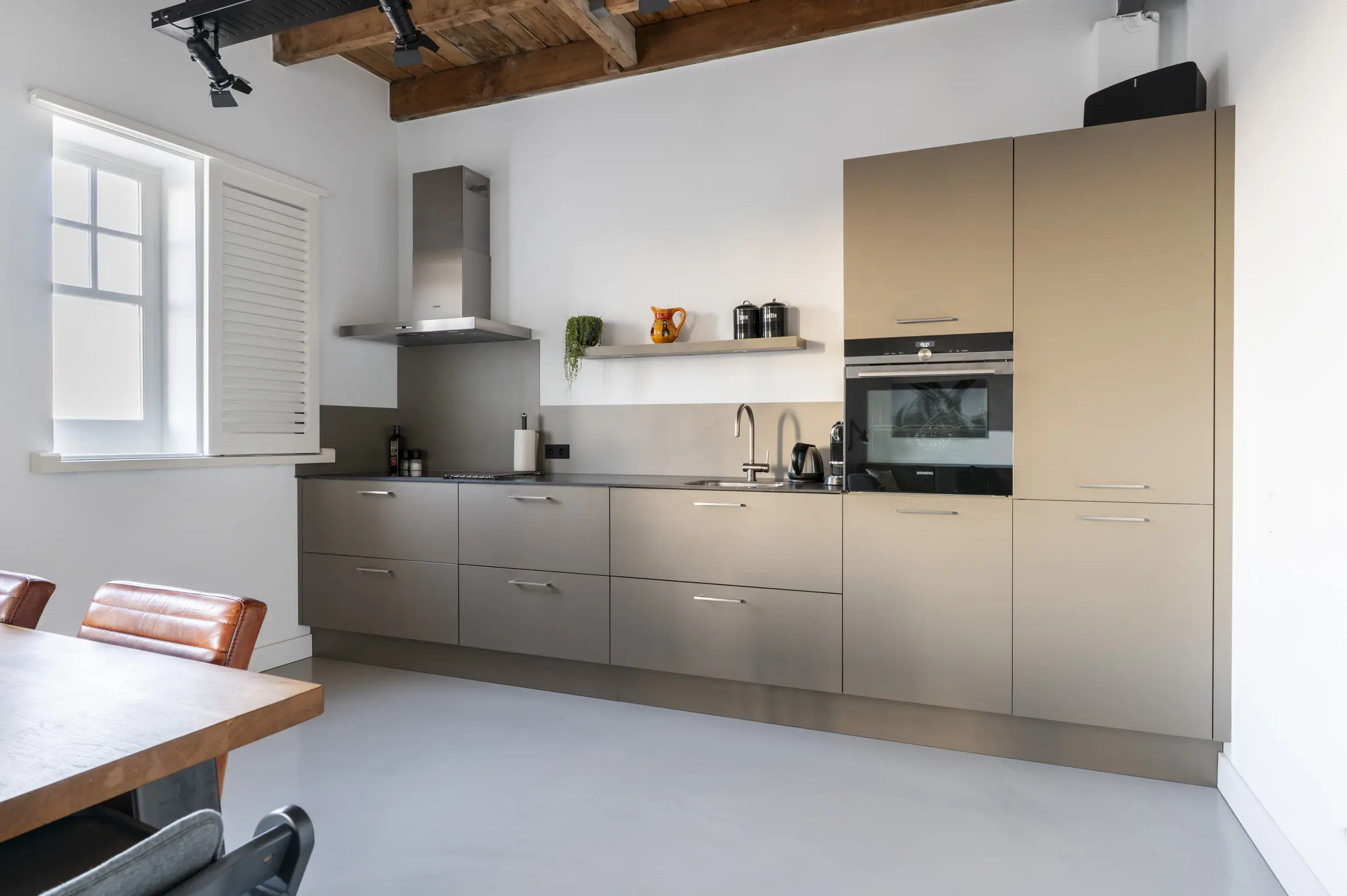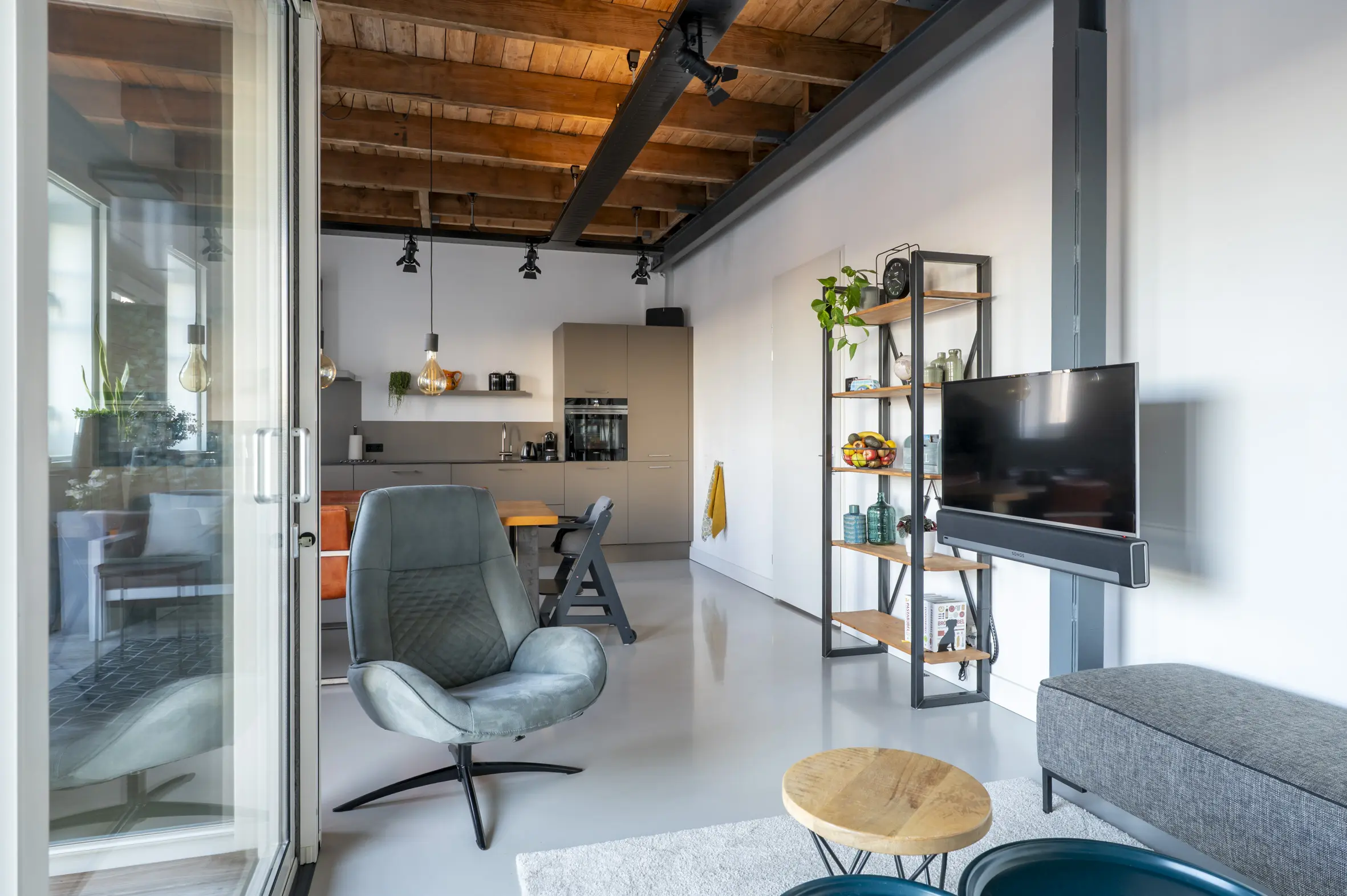 De woonkamer is licht en strak afgewerkt, met een schuifpui naar de loggia. Hier zit je beschut en heb je zicht op het parkeerdek van de naastgelegen supermarkt. De open keuken is modern en voorzien van: