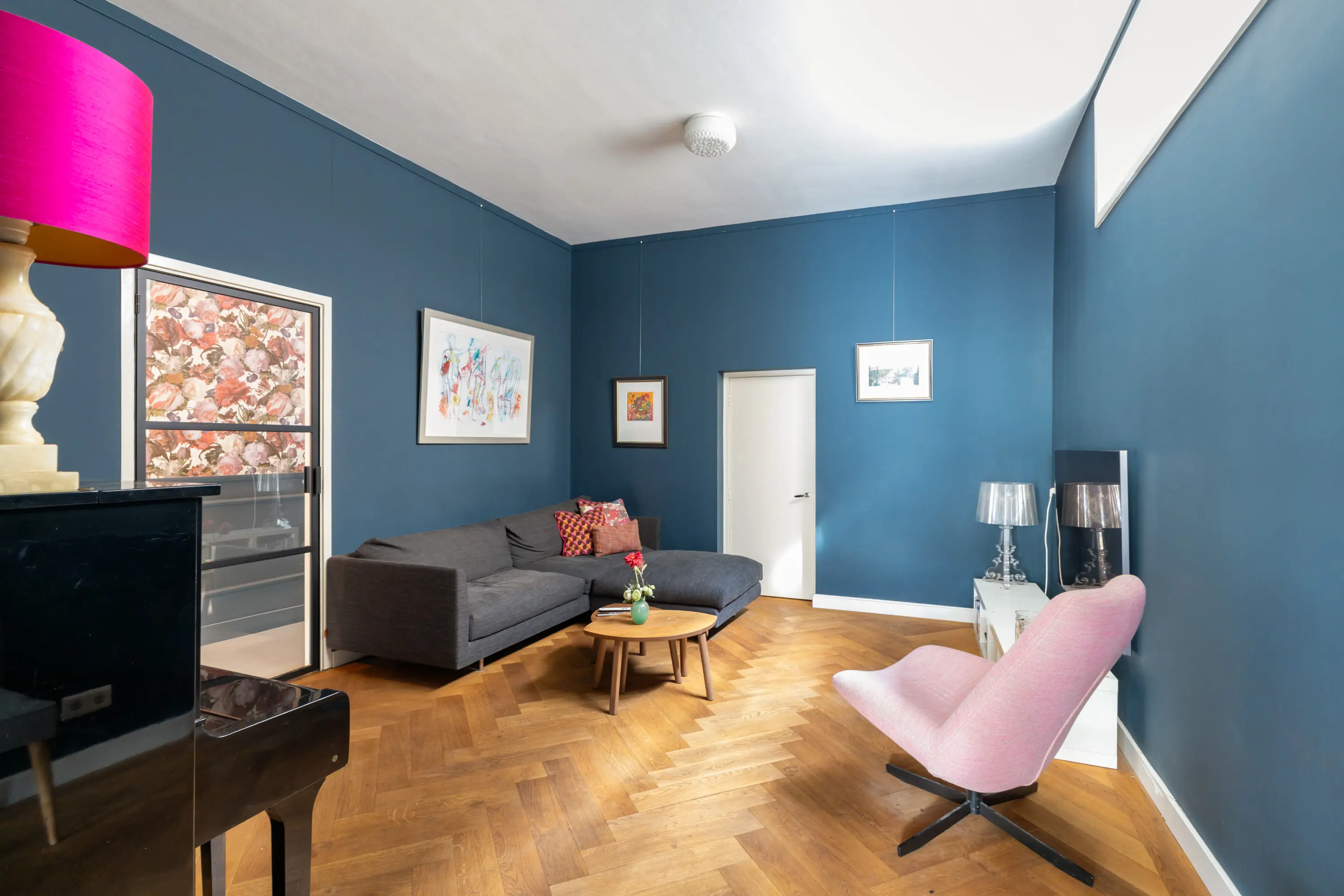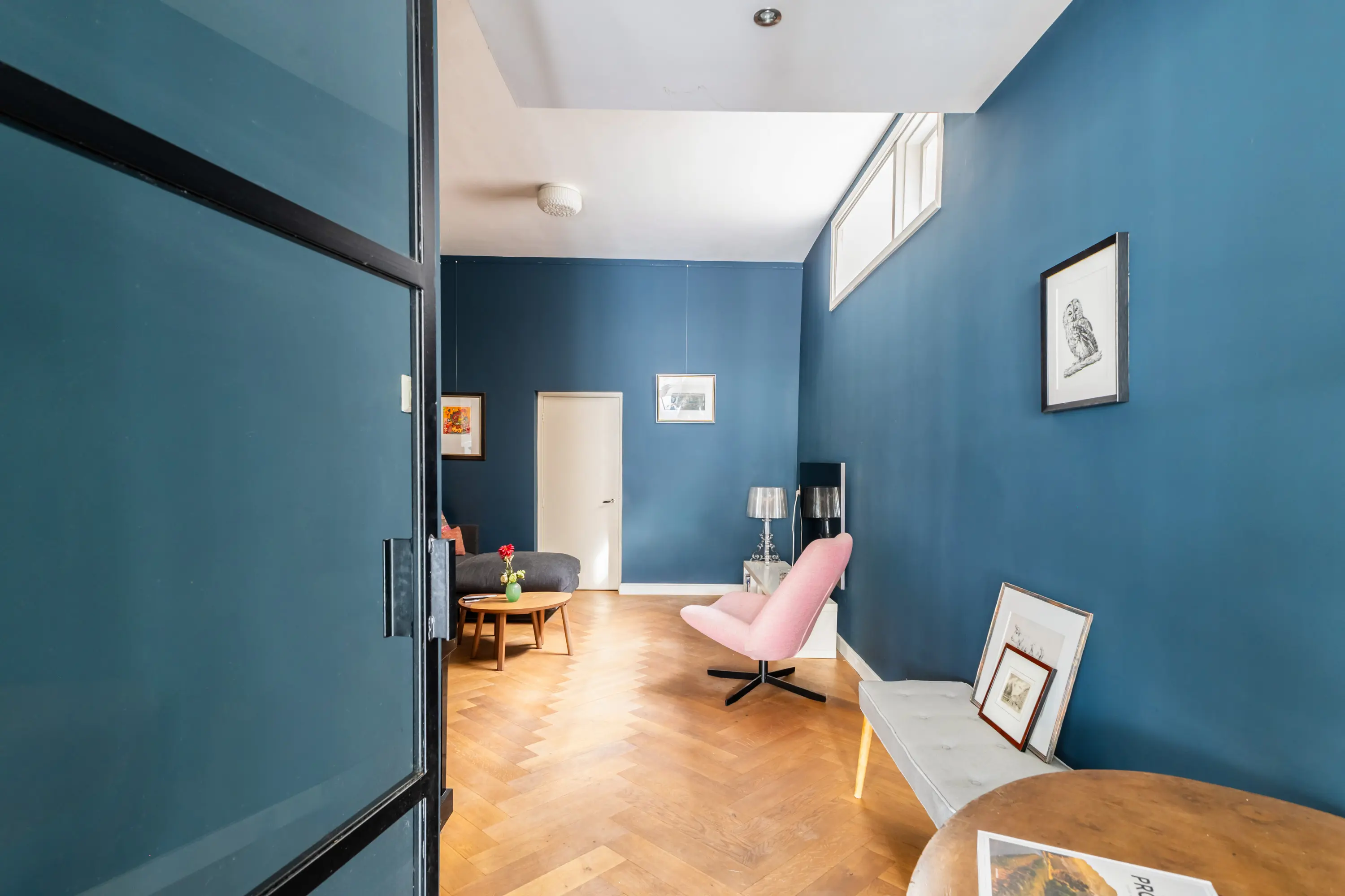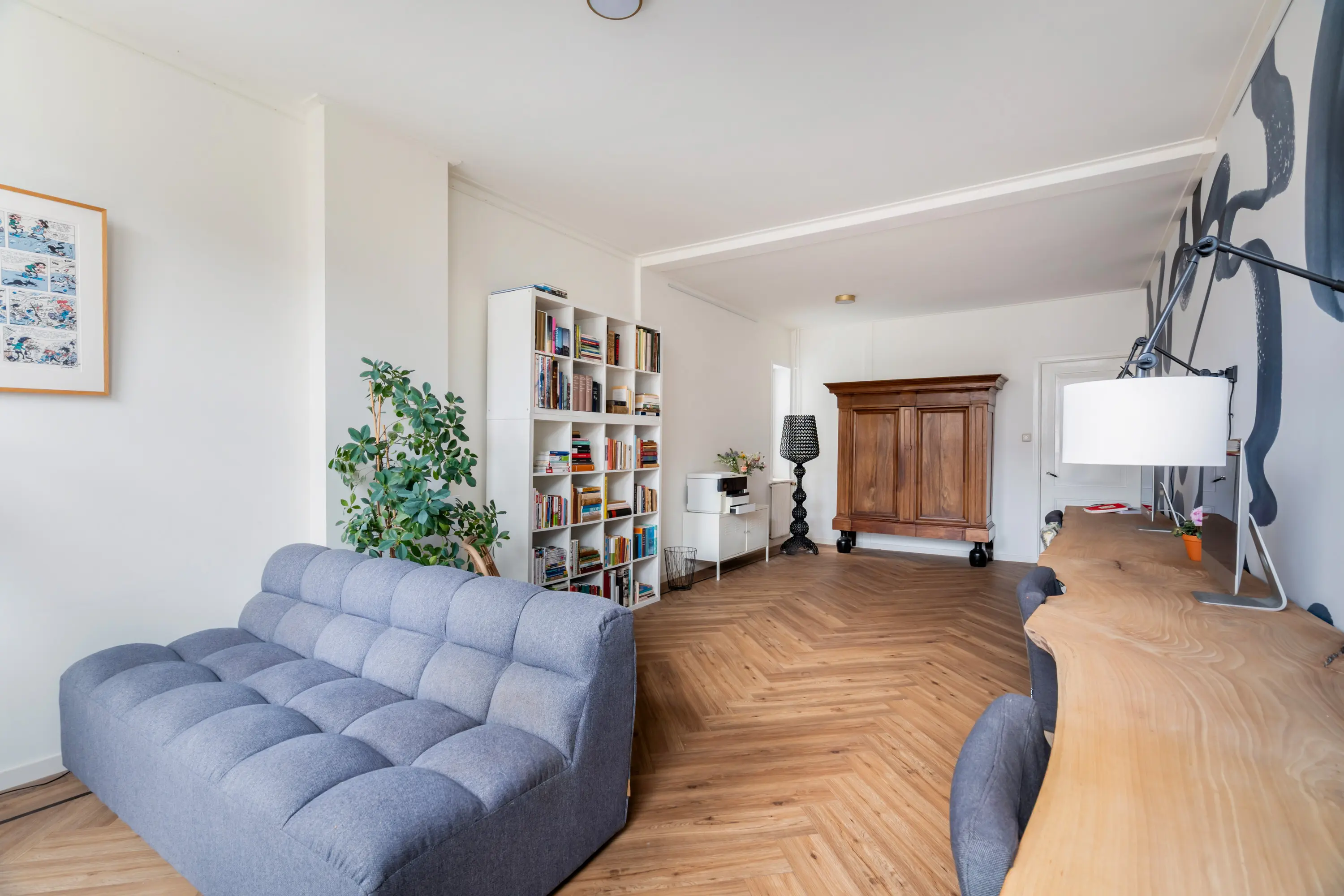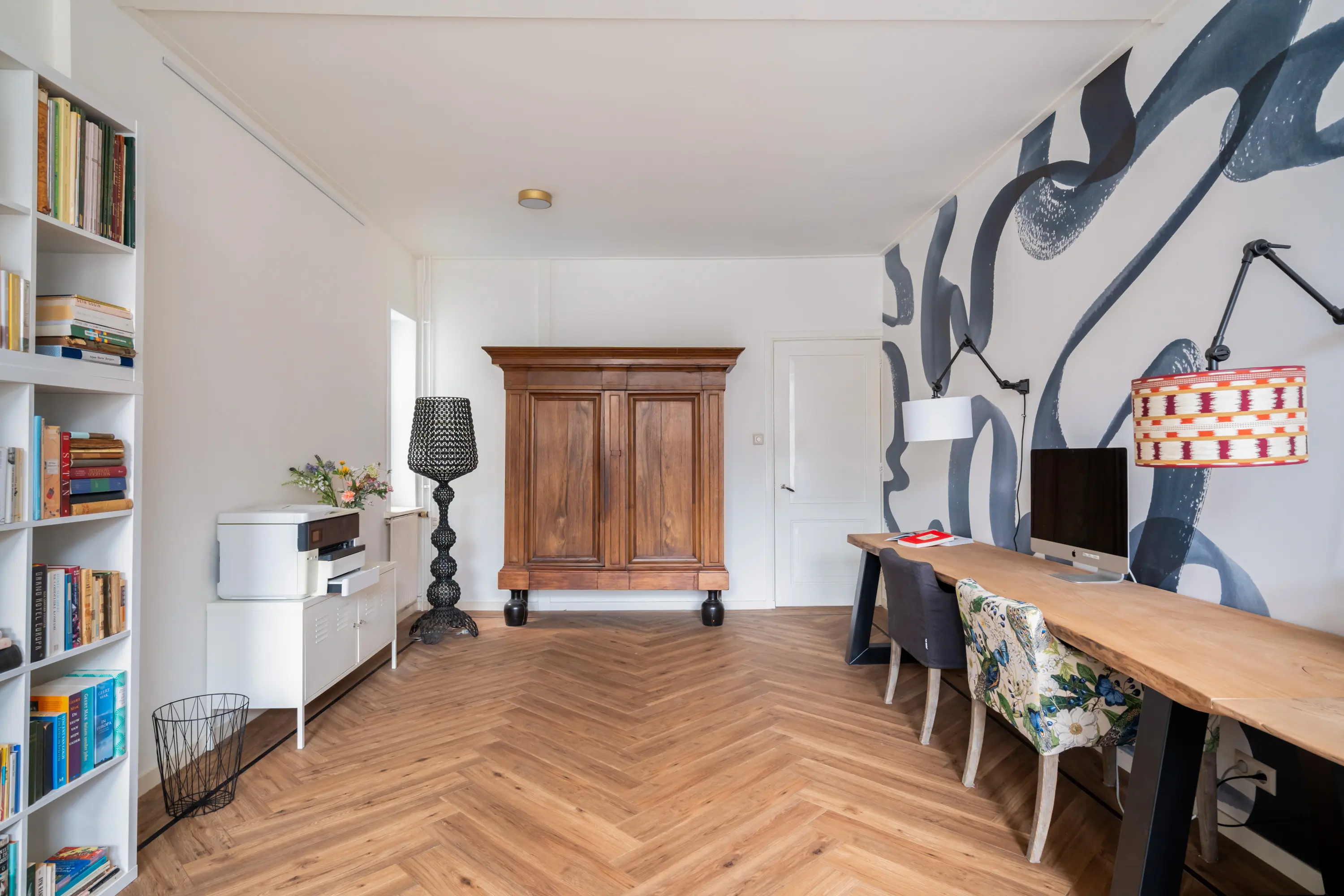 De overloop geeft toegang tot een grote kamer aan de voorzijde, nu ingericht als kantoorruimte met een royale zithoek. Dit is een lichte en veelzijdige ruimte met een prachtig uitzicht over de gracht.