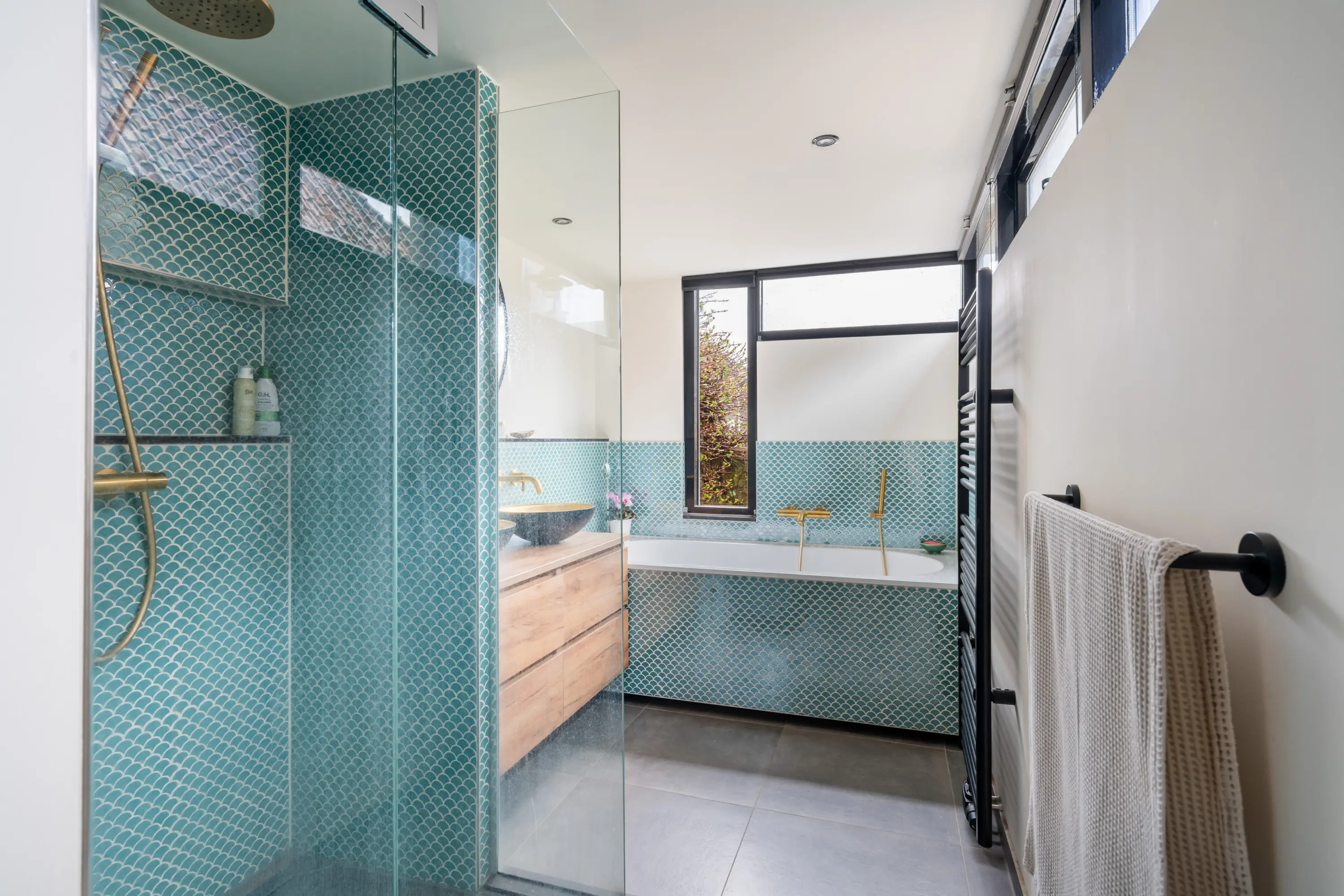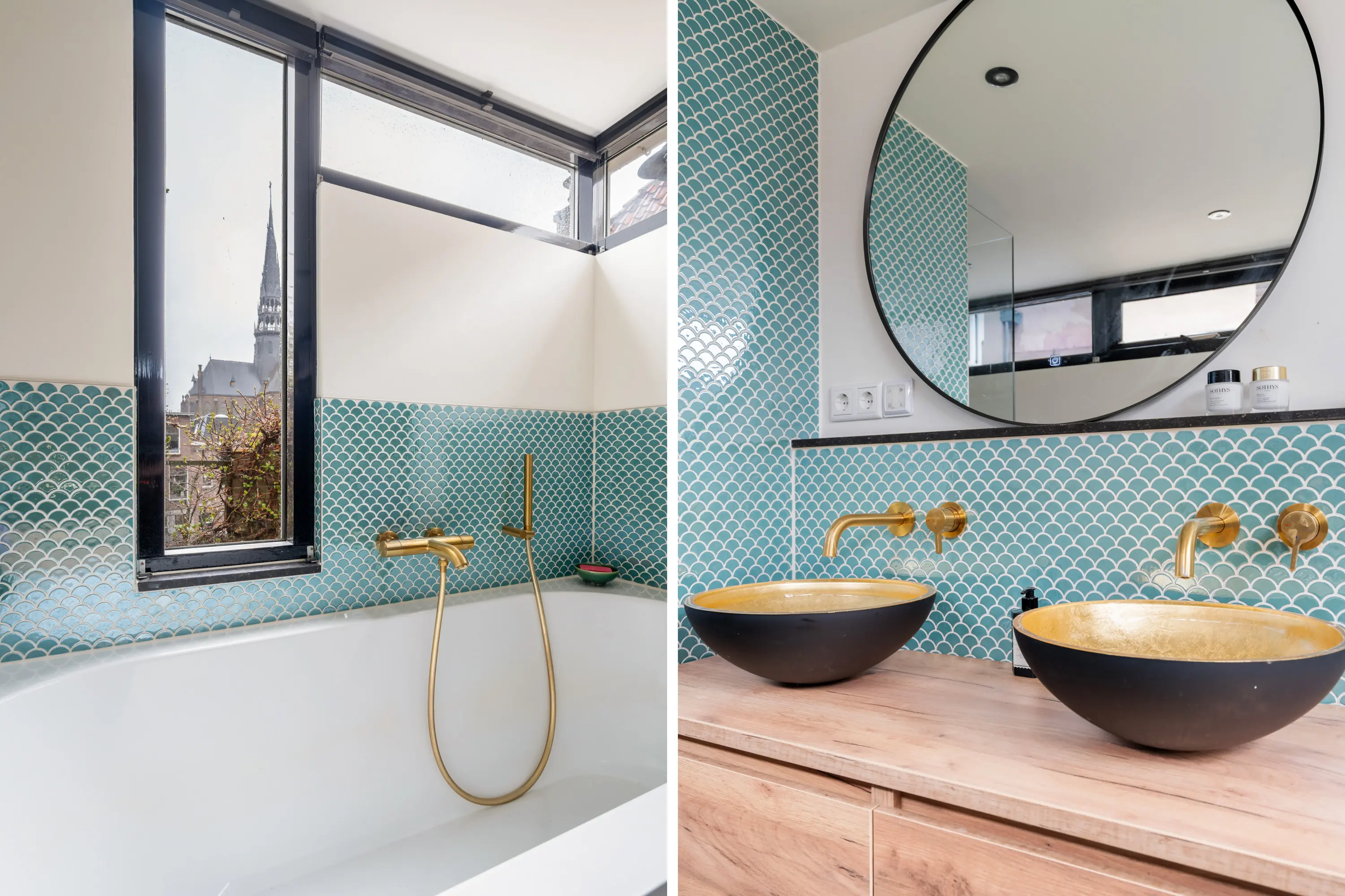 Aan de achterzijde ligt een ruime slaapkamer met airco, walk-in closet en toegang tot het (nog te realiseren) dakterras. Vanuit deze slaapkamer loop je via de gang langs de wasruimte en het tweede toilet naar de badkamer (2023) aan de achterzijde. De badkamer is ingericht met een ligbad met uitzicht op de kerktoren, een ruime douche en een wastafelmeubel met twee waskommen.