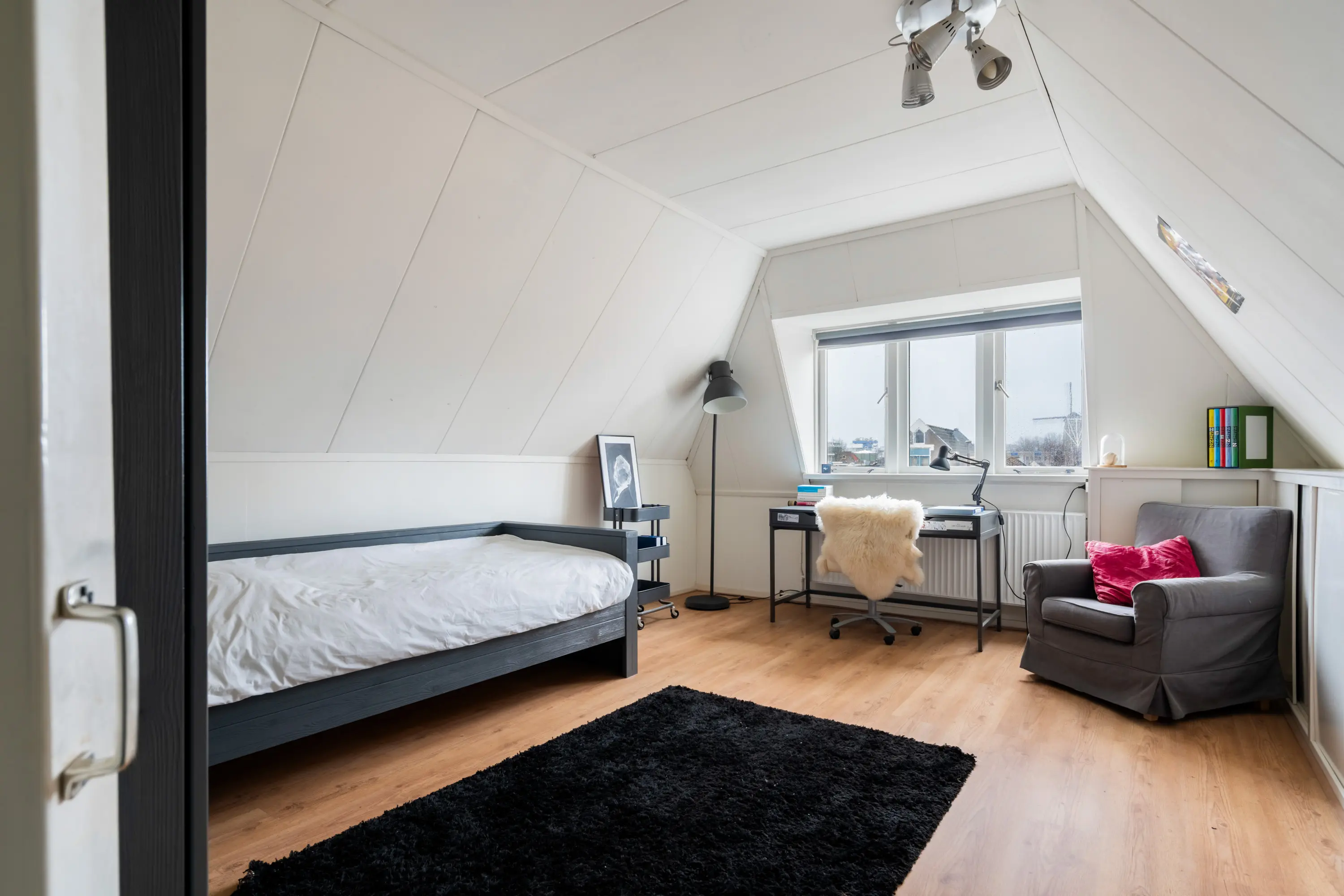 Ook deze verdieping is goed in te delen voor slapen, werken of logeren.